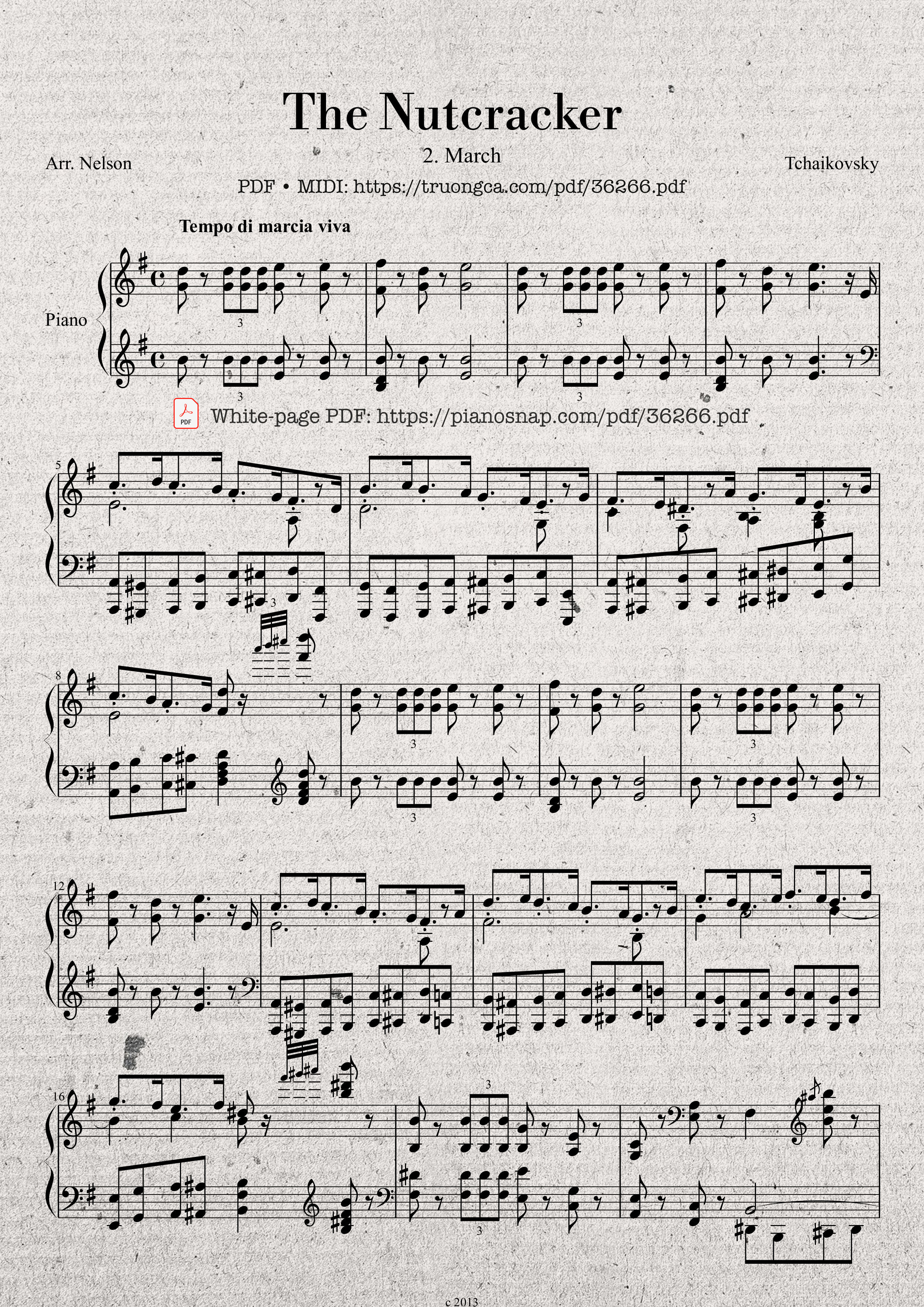 The Videos/audios The Nutcracker March for Piano by Pyotr Ilyich Tchaikovsky were embed from Youtube, Musescore or the other 3rd links. Videos are subject to 3rd's copyright control and may be removed by YouTube's copyright rules and 3rd's policies or maybe included advertisements. If you cannot access to these videos/audios, this mean that have been removed.