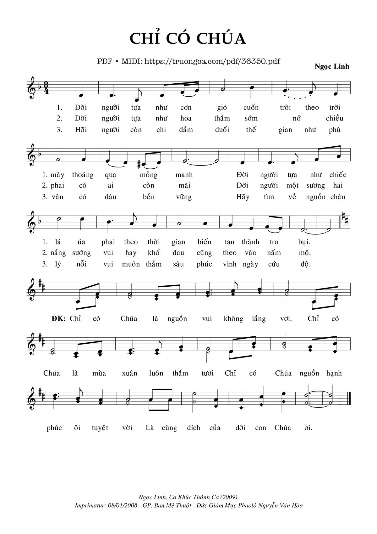 Điệp khúc. Chỉ có Chúa là nguồn vui không lắng vơi. Chỉ có Chúa là mùa xuân luôn thắm tươi. Chỉ có Chúa nguồn hạnh phúc ôi tuyệt vời. Là cùng đích của đời con Chúa ơi.