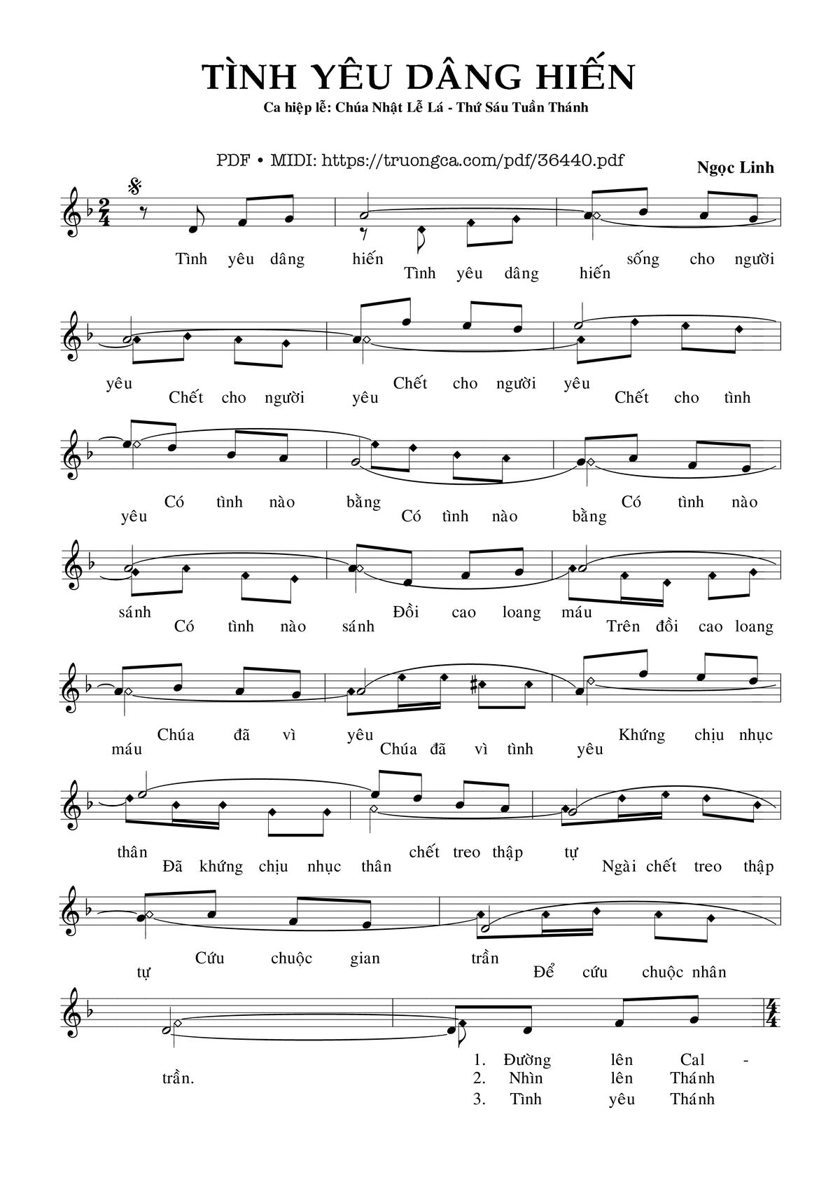 Điệp khúc. Tình yêu dâng hiến (Tình yêu dâng hiến), sống cho người yêu (chết cho người yêu), chết cho người yêu (chết cho tình yêu). Có tình nào bằng (Có tình nào bằng), có tình nào sánh (có tình nào sánh). Đồi cao loang máu (Trên đồi cao loang máu), Chúa đã vì yêu (Chúa đã vì tình yêu) khứng chịu nhục thân (đã khứng chịu nhục thân) chết treo thập tự (Ngài chết treo thập tự) cứu chuộc gian trần (để cứu chuộc nhân trần).