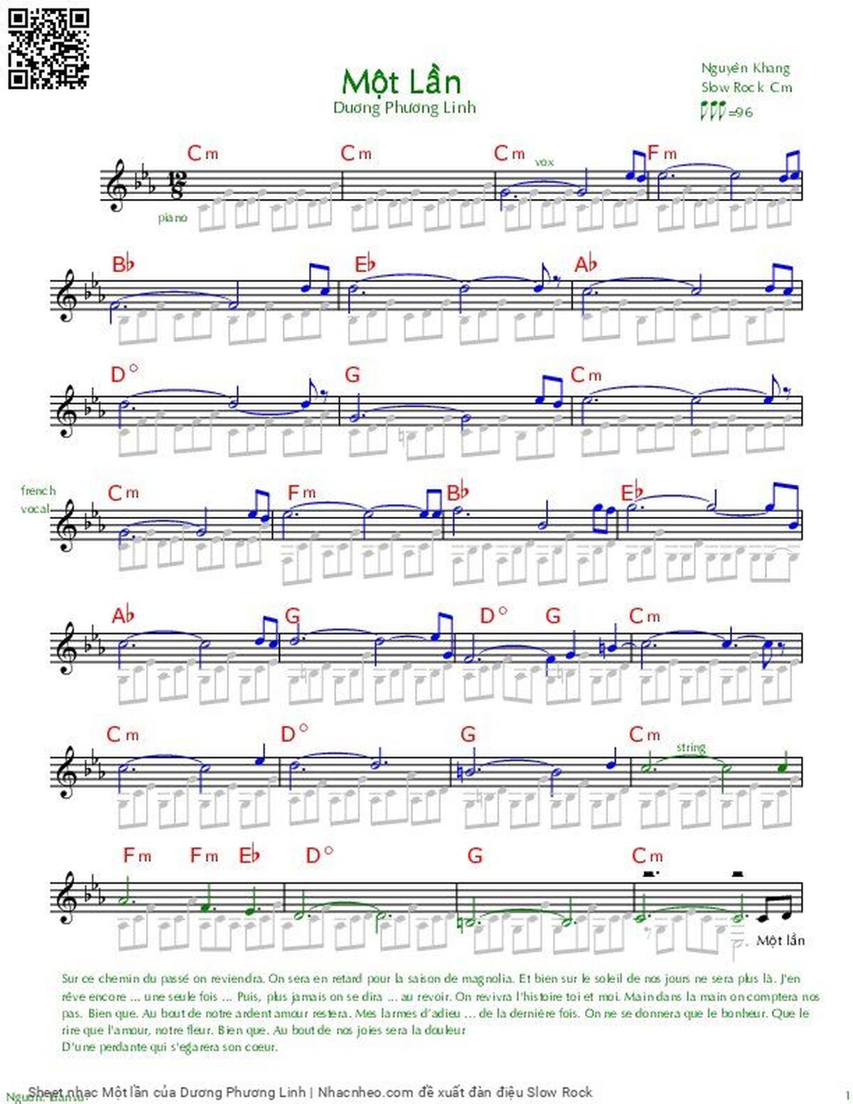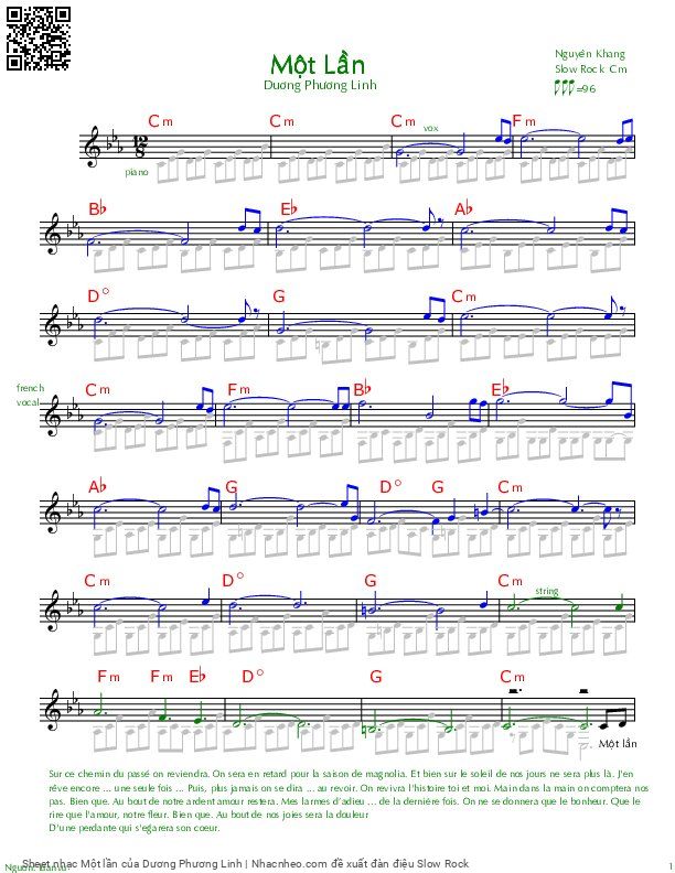 Transposition is the process of moving a song's melody and chords up or down in pitch by a constant interval. The direction of the transposition tool is indicated by a plus (+) sign for up and a minus (-) sign for down. Hover mouse over chords signs to see the chords chart of Một lần song.
