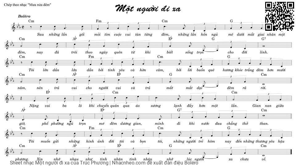 The Videos/audios Một người đi xa by Trúc Phương were embed from Youtube, Musescore or the other 3rd links. Videos are subject to 3rd's copyright control and may be removed by YouTube's copyright rules and 3rd's policies or maybe included advertisements. If you cannot access to these songs, this mean that have been removed.