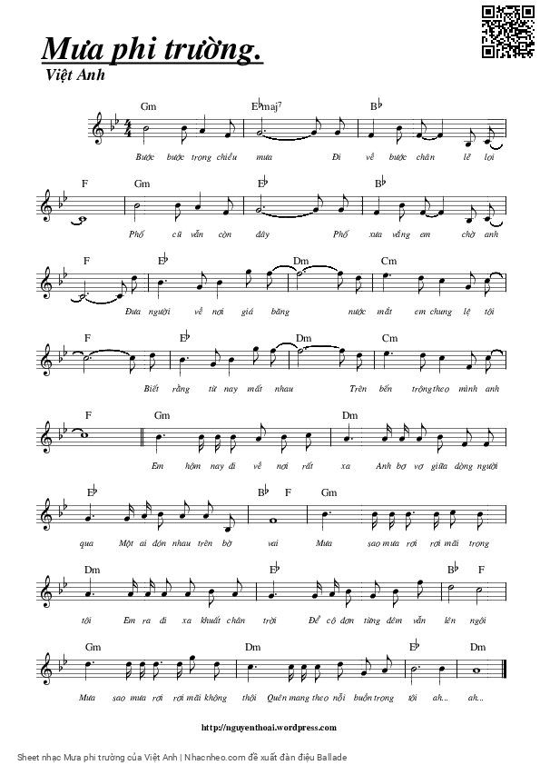 Transposition is the process of moving a song's melody and chords up or down in pitch by a constant interval. The direction of the transposition tool is indicated by a plus (+) sign for up and a minus (-) sign for down. Hover mouse over chords signs to see the chords chart of Mưa phi trường song.