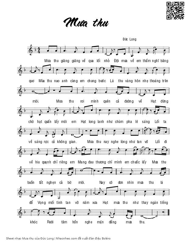Đức Long Mưa thu giăng giăng về qua lối nhỏ Đội mưa về em thầm nghĩ bâng quơ [PDF] [Sheet] [Lyrics] [Mp4/Midi]