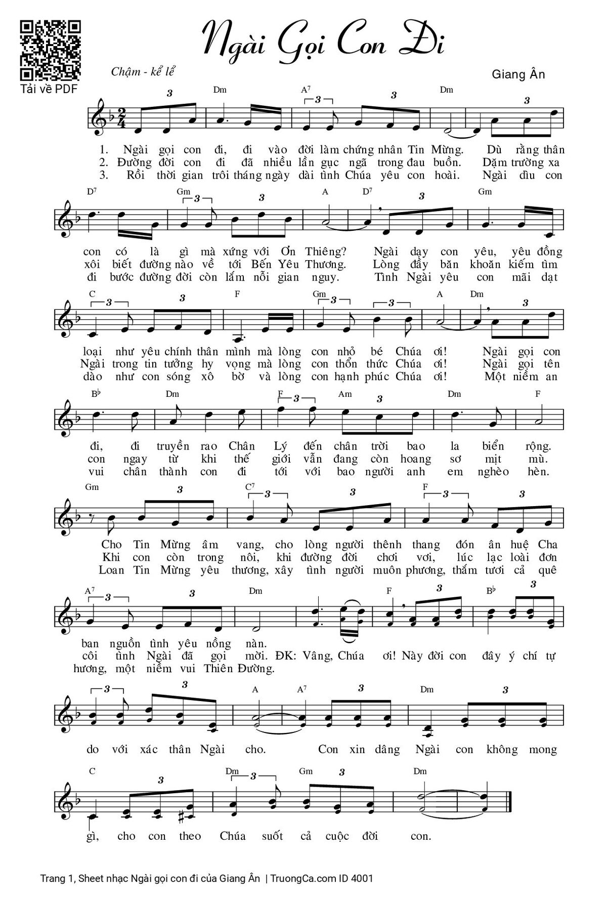 Transposition is the process of moving a song's melody and chords up or down in pitch by a constant interval. The direction of the transposition tool is indicated by a plus (+) sign for up and a minus (-) sign for down. Hover mouse over chords signs to see the chords chart of Ngài gọi con đi song.