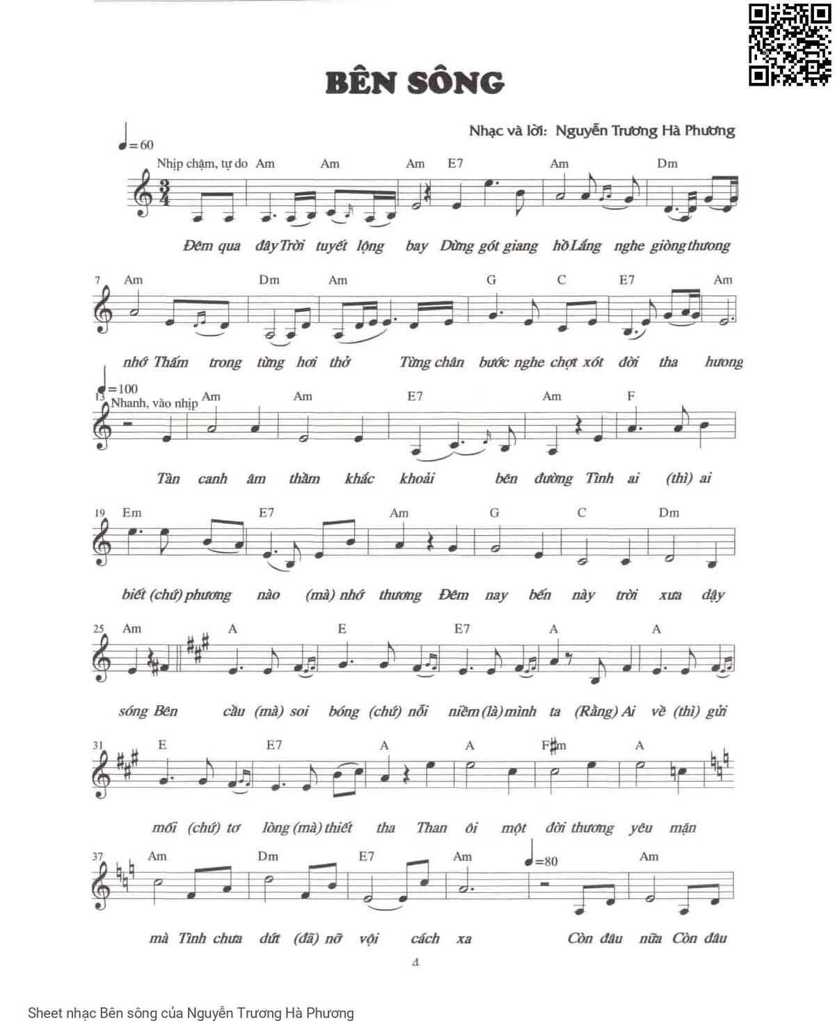 Transposition is the process of moving a song's melody and chords up or down in pitch by a constant interval. The direction of the transposition tool is indicated by a plus (+) sign for up and a minus (-) sign for down. Hover mouse over chords signs to see the chords chart of Bên sông song.