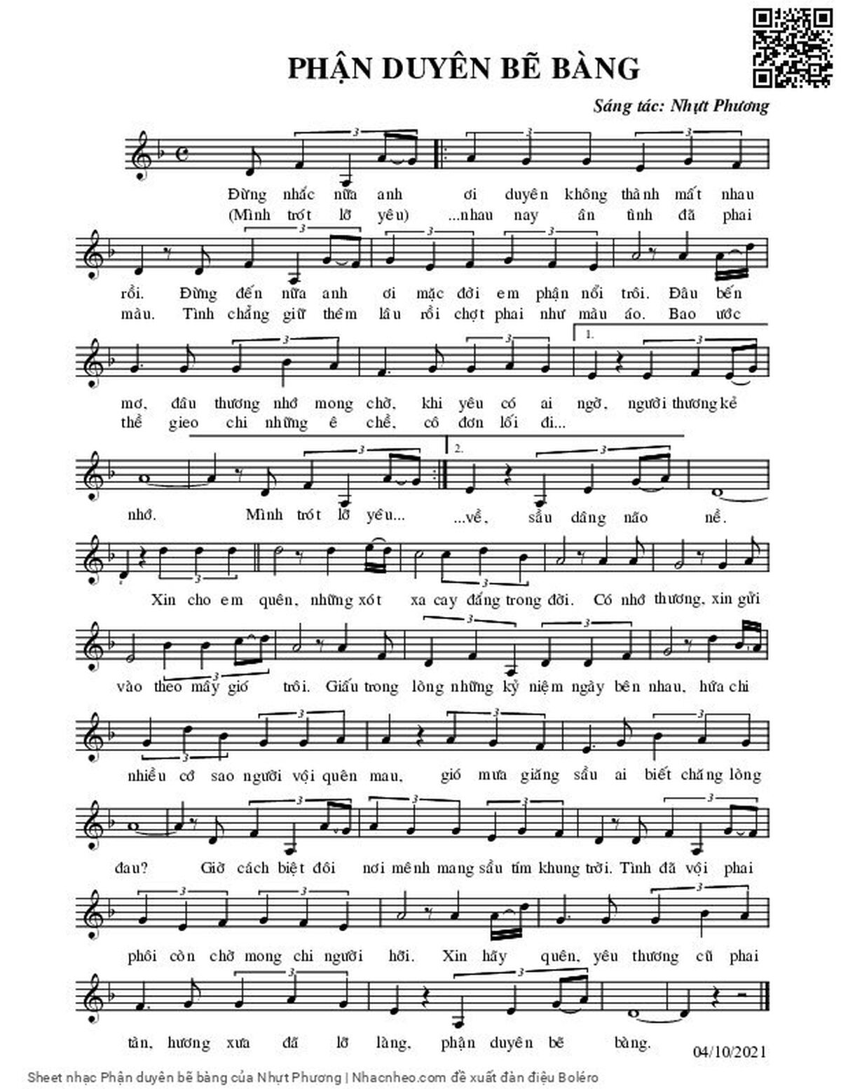 Nhựt Phương Đừng nhắc nữa anh ơi duyên không thành mất nhau rồi [PDF] [Sheet] [Lyrics] [Mp4/Midi]