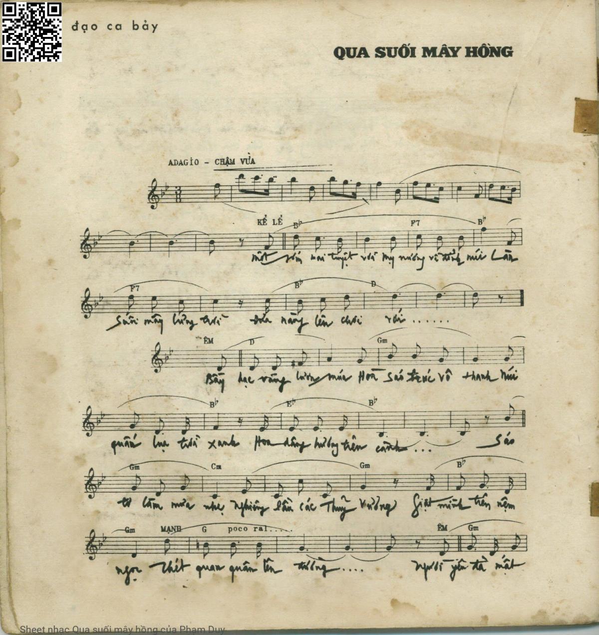 Transposition is the process of moving a song's melody and chords up or down in pitch by a constant interval. The direction of the transposition tool is indicated by a plus (+) sign for up and a minus (-) sign for down. Hover mouse over chords signs to see the chords chart of Qua suối mây hồng song.
