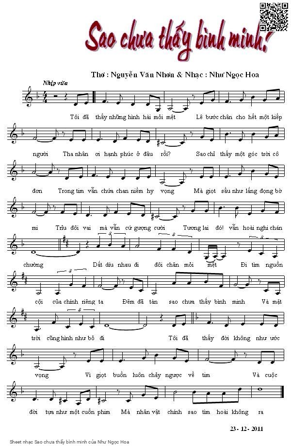 The Videos/audios Sao chưa thấy bình minh by Như Ngọc Hoa were embed from Youtube, Musescore or the other 3rd links. Videos are subject to 3rd's copyright control and may be removed by YouTube's copyright rules and 3rd's policies or maybe included advertisements. If you cannot access to these songs, this mean that have been removed.
