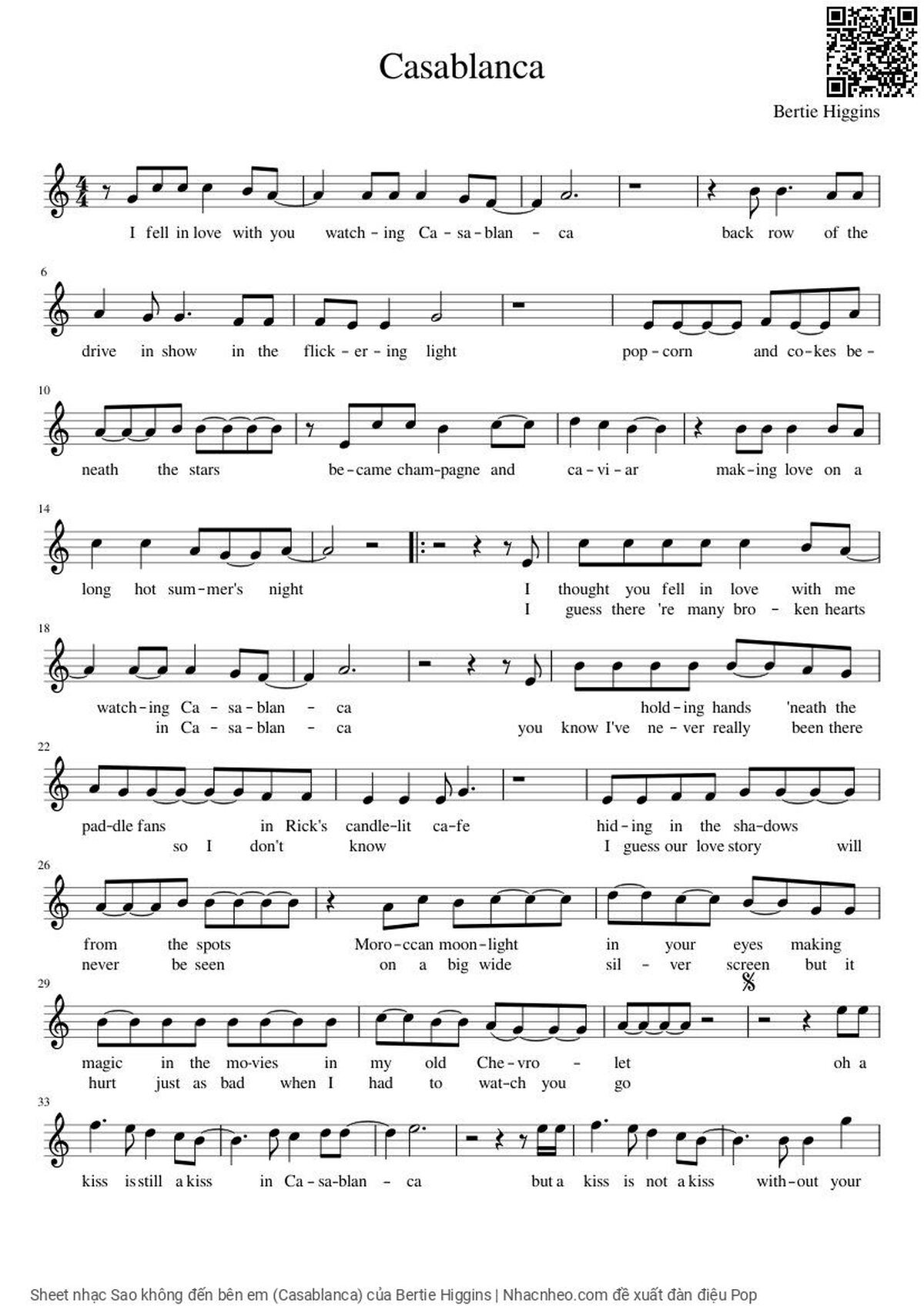 Bertie Higgins I fell in love with you watching Casa blanca Back row at the drive in show in the flickering light [PDF] [Sheet] [Lyrics] [Mp4/Midi]