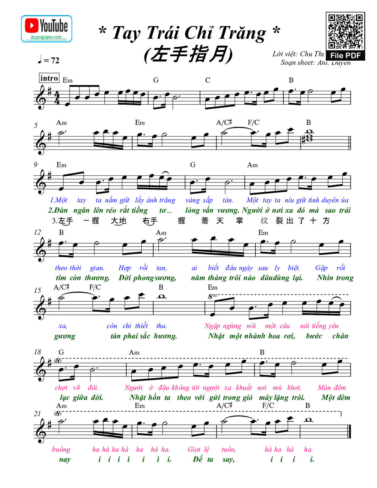 Sheet PDF with the same name Tay trái chỉ trăng (Zuǒ shǒu zhǐ yuè - 左手指月):