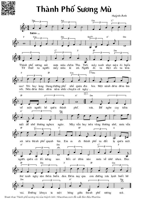 Huỳnh Anh Thành phố sương mù mưa mùa chớm thu [PDF] [Sheet] [Lyrics] [Mp4/Midi]