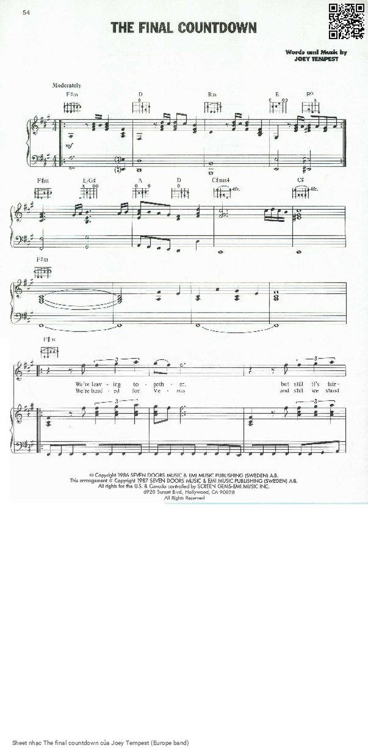 The Videos/audios The final countdown by Joey Tempest (Europe band) were embed from Youtube, Musescore or the other 3rd links. Videos are subject to 3rd's copyright control and may be removed by YouTube's copyright rules and 3rd's policies or maybe included advertisements. If you cannot access to these songs, this mean that have been removed.