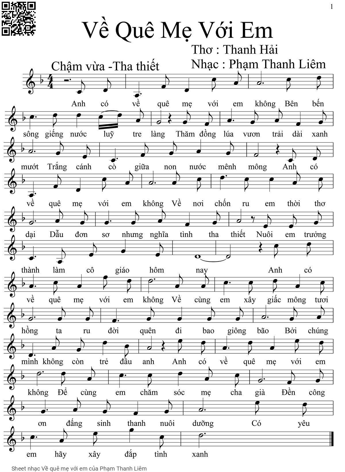 Phạm Thanh Liêm Anh có về quê mẹ với em không Bên bến sông giếng nước lũy tre làng [PDF] [Sheet] [Lyrics] [Mp4/Midi]