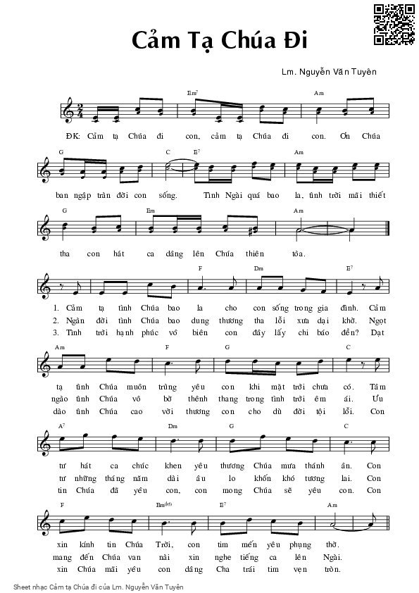 Transposition is the process of moving a song's melody and chords up or down in pitch by a constant interval. The direction of the transposition tool is indicated by a plus (+) sign for up and a minus (-) sign for down. Hover mouse over chords signs to see the chords chart of Cảm tạ Chúa đi song.
