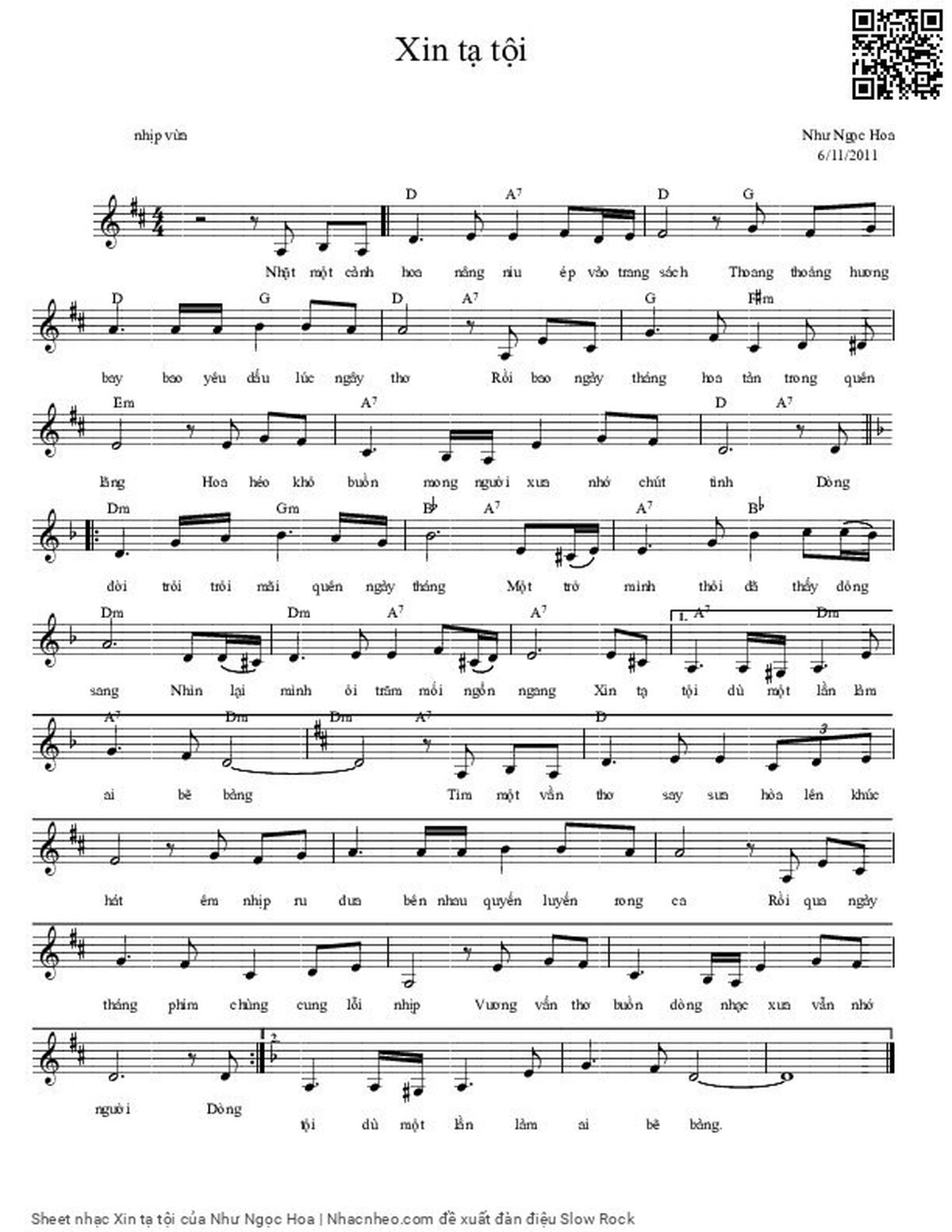 Transposition is the process of moving a song's melody and chords up or down in pitch by a constant interval. The direction of the transposition tool is indicated by a plus (+) sign for up and a minus (-) sign for down. Hover mouse over chords signs to see the chords chart of Xin tạ tội song.