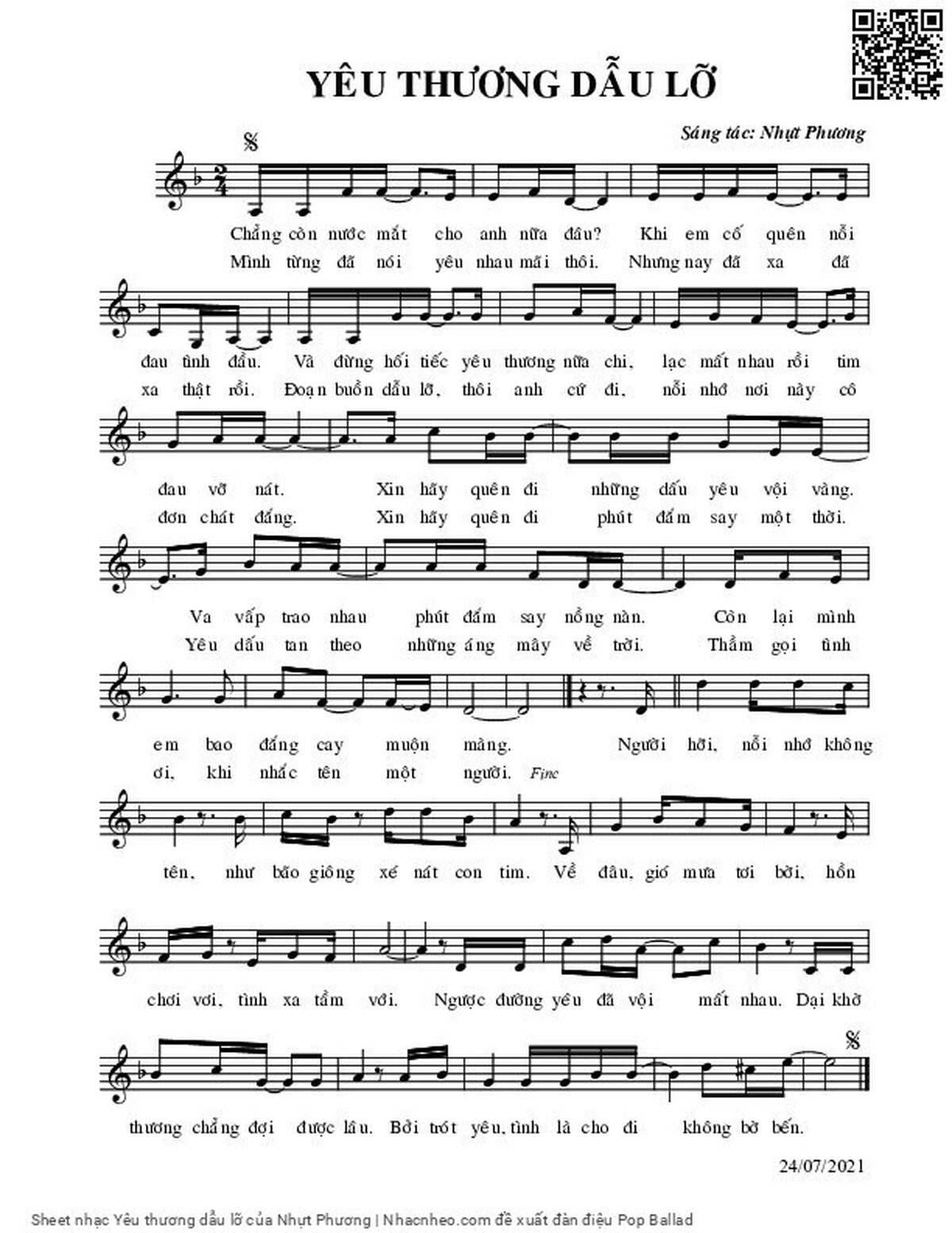 Nhựt Phương Chẳng còn nước mắt cho anh nữa đâu [PDF] [Sheet] [Lyrics] [Mp4/Midi]