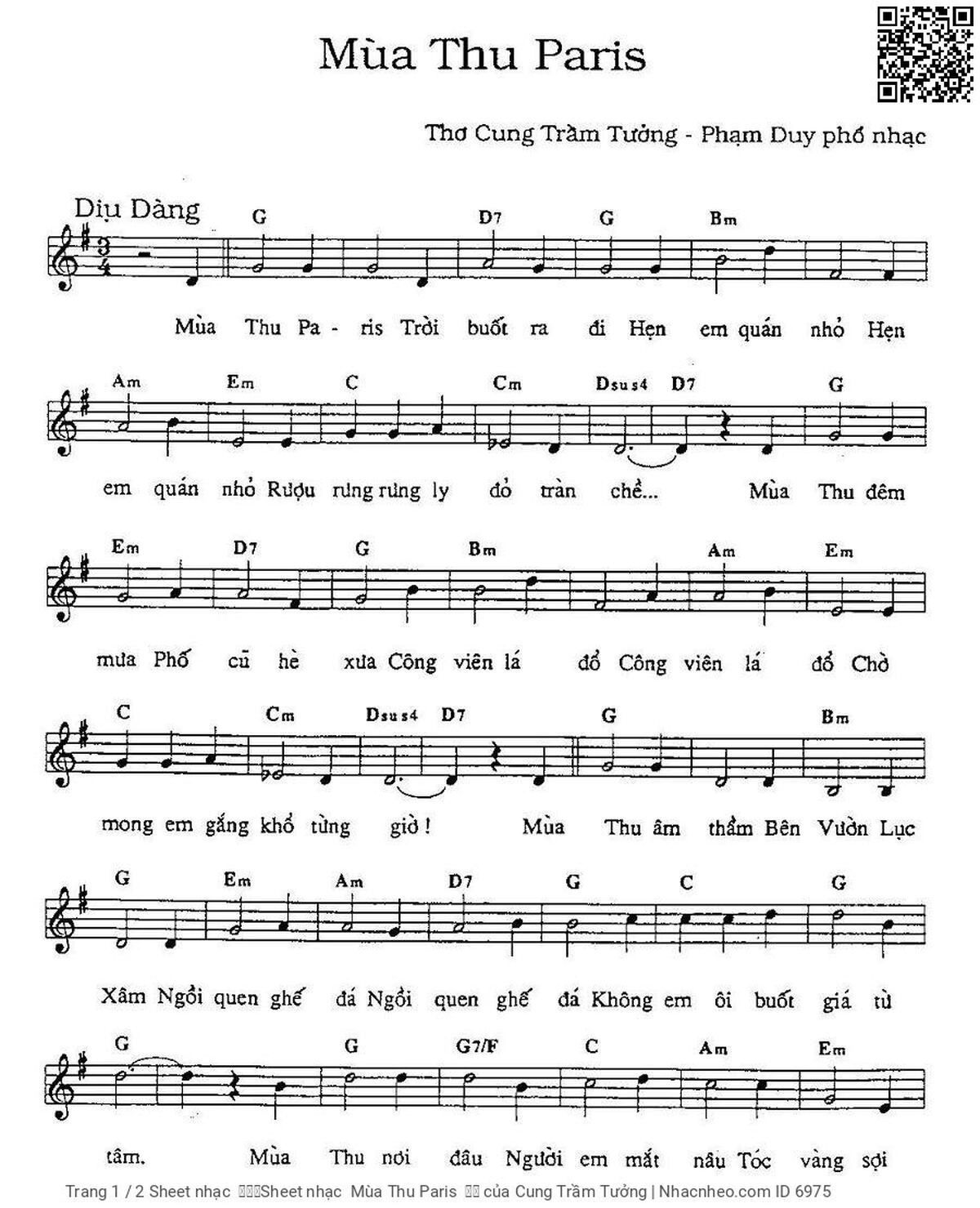 Sheet music Mùa Thu Paris by Cung Trầm Tưởng and PDF file was posted here to support you to practice singing perfectly. Sheets with notes and chords are for reference only, for non-commercial purposes only, not involved with earning money by buying and selling. Copyright is belong to song writer/author and copyright owner. Truongca.com do not own any copyrighted content. You can download the high-quality PDF files which contain staffs by PDF link above.
