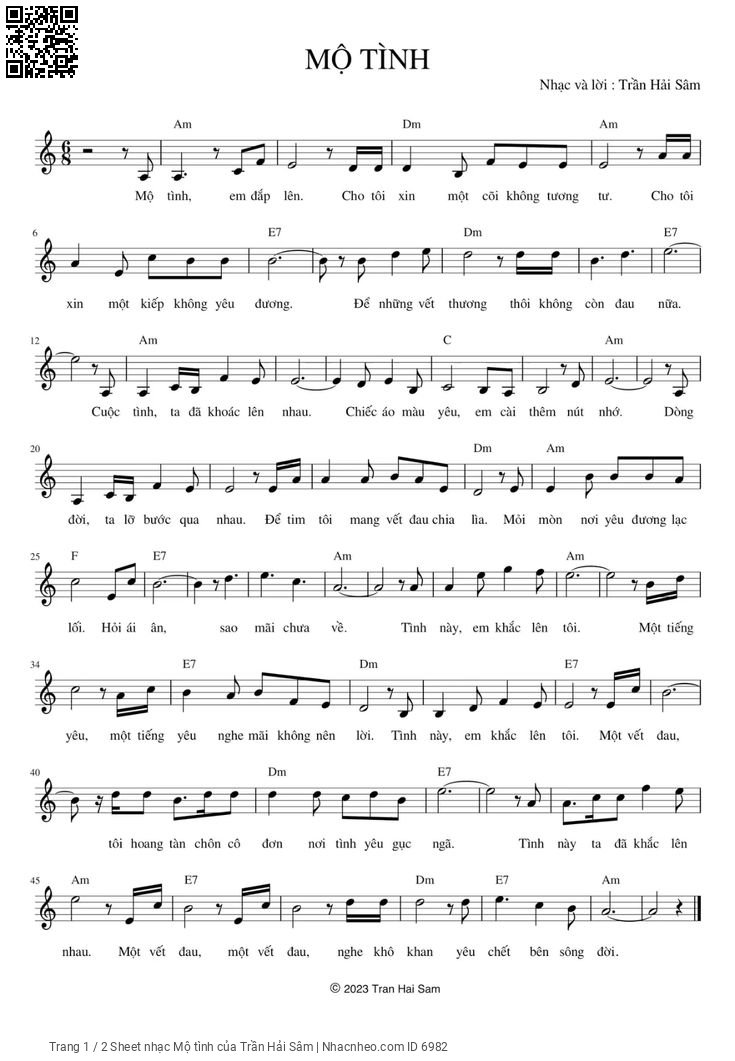 Trần Hải Sâm Mộ tình em đắp lên Cho tôi xin một cõi không tương tư [PDF] [Sheet] [Lyrics] [Mp4/Midi]
