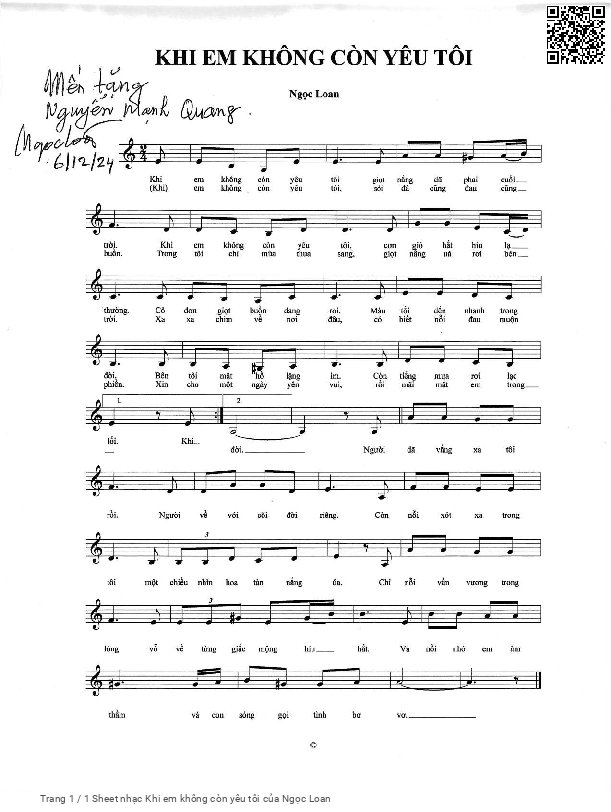 Ngọc Loan Khi em không còn yêu tôi giọt nắng đã phai cuối trời [PDF] [Sheet] [Lyrics] [Mp4/Midi]