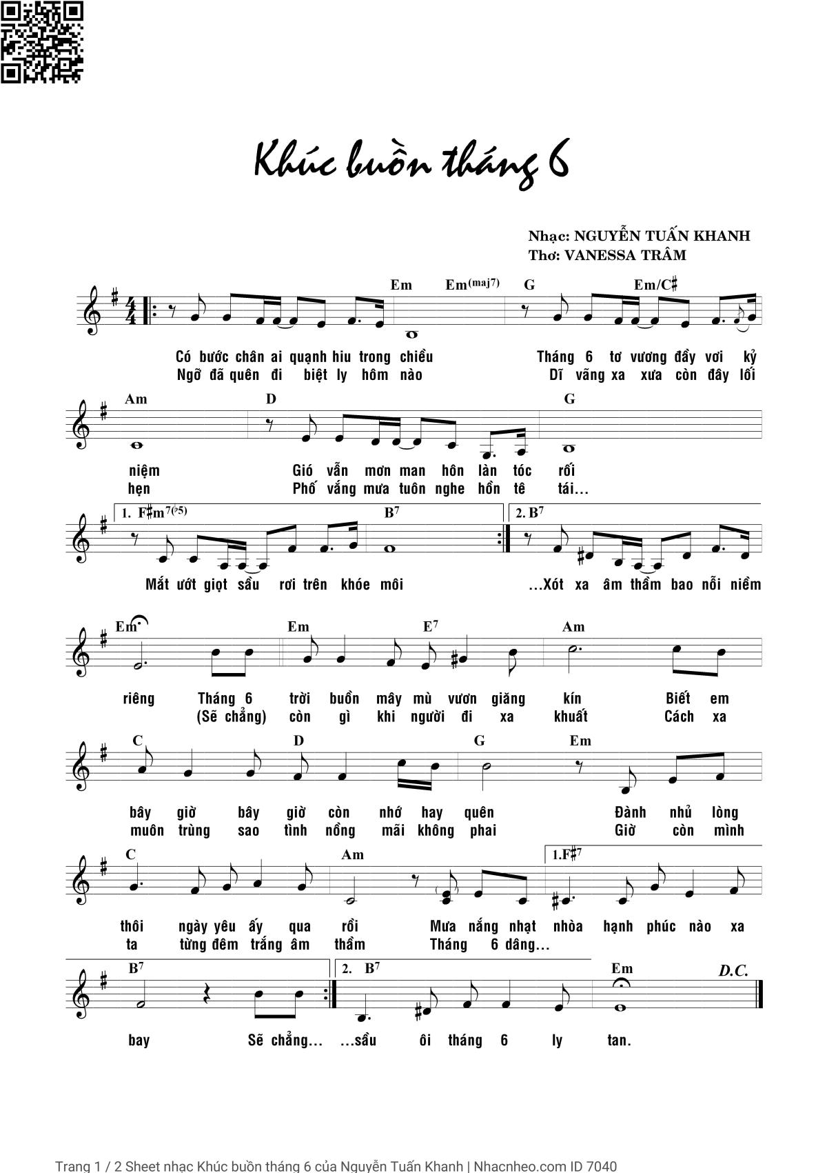 Transposition is the process of moving a song's melody and chords up or down in pitch by a constant interval. The direction of the transposition tool is indicated by a plus (+) sign for up and a minus (-) sign for down. Hover mouse over chords signs to see the chords chart of Khúc buồn tháng 6 song.