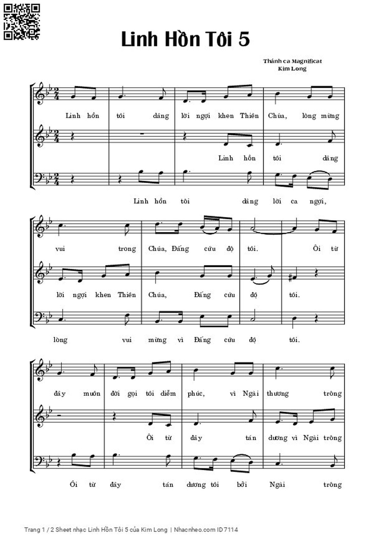 ĐK: Linh hồn tôi dâng lời ngợi khen Thiên Chúa, lòng mừng vui trong Chúa Đấng cứu độ tôi. Ôi từ nay muôn đời gọi tôi diễm phúc, vì Ngài thương trông đến phận tôi tớ này. 1. Ôi Đấng Toàn năng đã làm cho tôi muôn điều kỳ diệu, danh Ngài là Thánh. Tình Ngài trải qua muôn thế hệ dành cho ai luôn kính sợ Ngài.