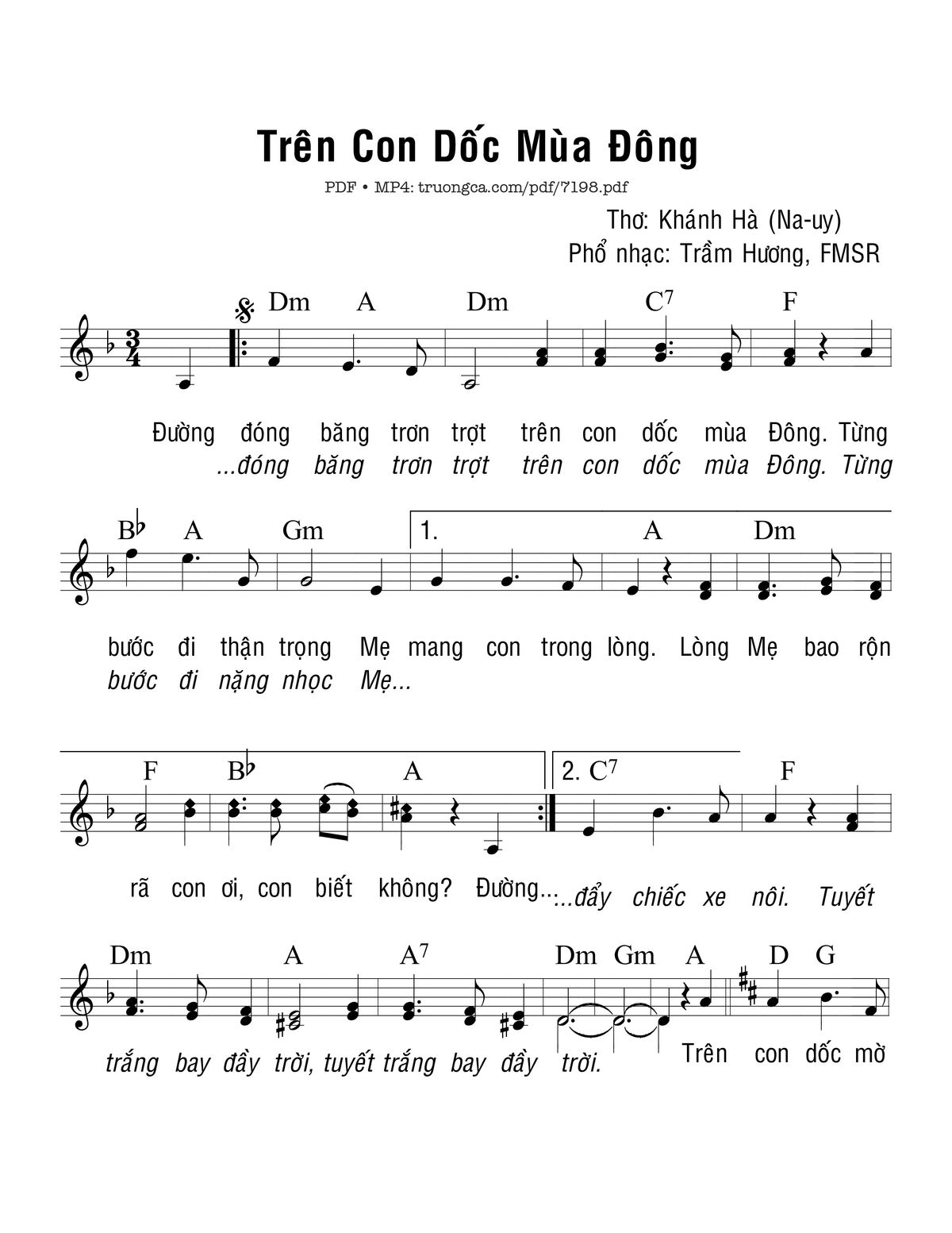 Đường đóng băng trơn trợt trên con dốc mùa Đông. Từng bước đi thận trọng Mẹ mang con trong lòng. Mẹ bao rộn rã con ơi, con biết không? Đường đóng băng trơn trợt trên con dốc mùa Đông. Từng bước đi nặng nhọc Mẹ đẩy chiếc xe nôi. Tuyết trắng bay đầy trời, tuyết trắng bay đầy trời.