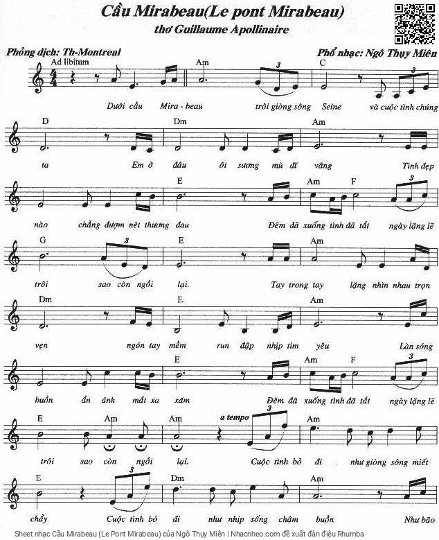 Ngô Thụy Miên Dưới cầu Mira beau Trôi dòng sông Seine Và cuộc tình chúng ta [PDF] [Sheet] [Lyrics] [Mp4/Midi]