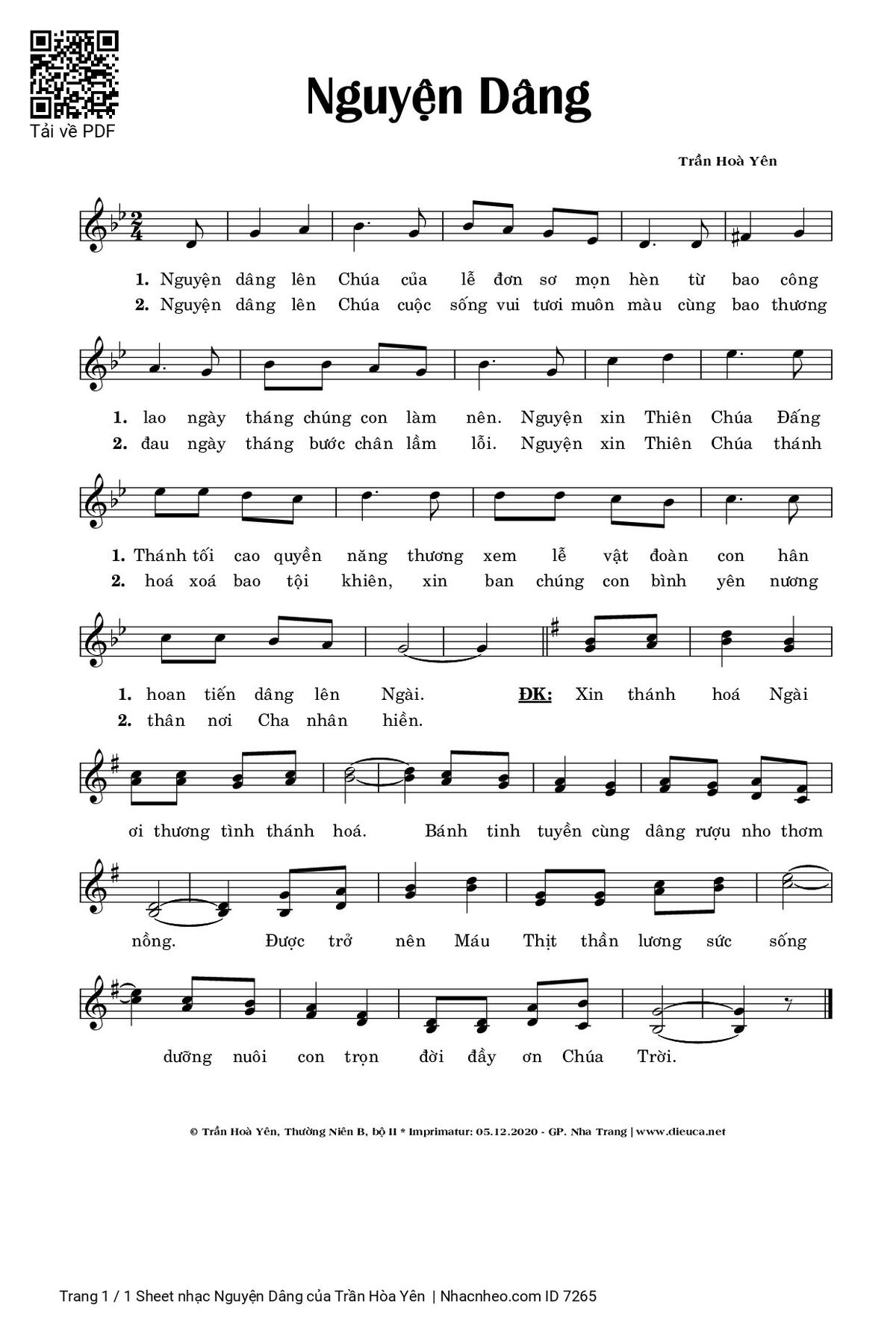Transposition is the process of moving a song's melody and chords up or down in pitch by a constant interval. The direction of the transposition tool is indicated by a plus (+) sign for up and a minus (-) sign for down. Hover mouse over chords signs to see the chords chart of Nguyện Dâng song.