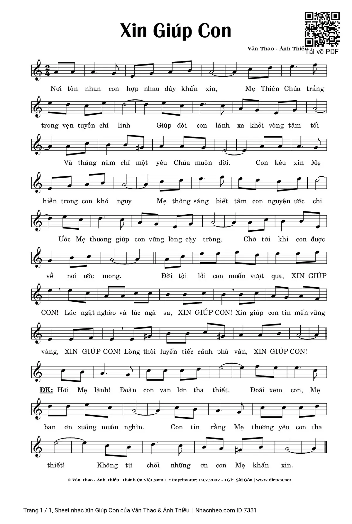 Nơi tôn nhan con họp nhau đây khấn xin. Mẹ Thiên Chúa trắng trong vẹn tuyền chí linh. Giúp đời con lánh xa khỏi vòng tăm tối, và tháng năm chỉ một yêu Chúa muôn đời. Con kêu xin Mẹ hiền trong cơn khó nguy, Mẹ thông sáng biết tâm con nguyện ước chi. Ước Mẹ thương giúp con vững lòng cậy trông, chờ tới khi con được về nơi ước mong. Đời tội lỗi con muốn vượt qua, XIN GIÚP CON! Lúc ngặt nghèo và lúc ngã sa, XIN GIÚP CON! Xin giúp con tin mến vững vàng, XIN GIÚP CON! Lòng thôi luyến tiếc cảnh phù vân, XIN GIÚP CON!