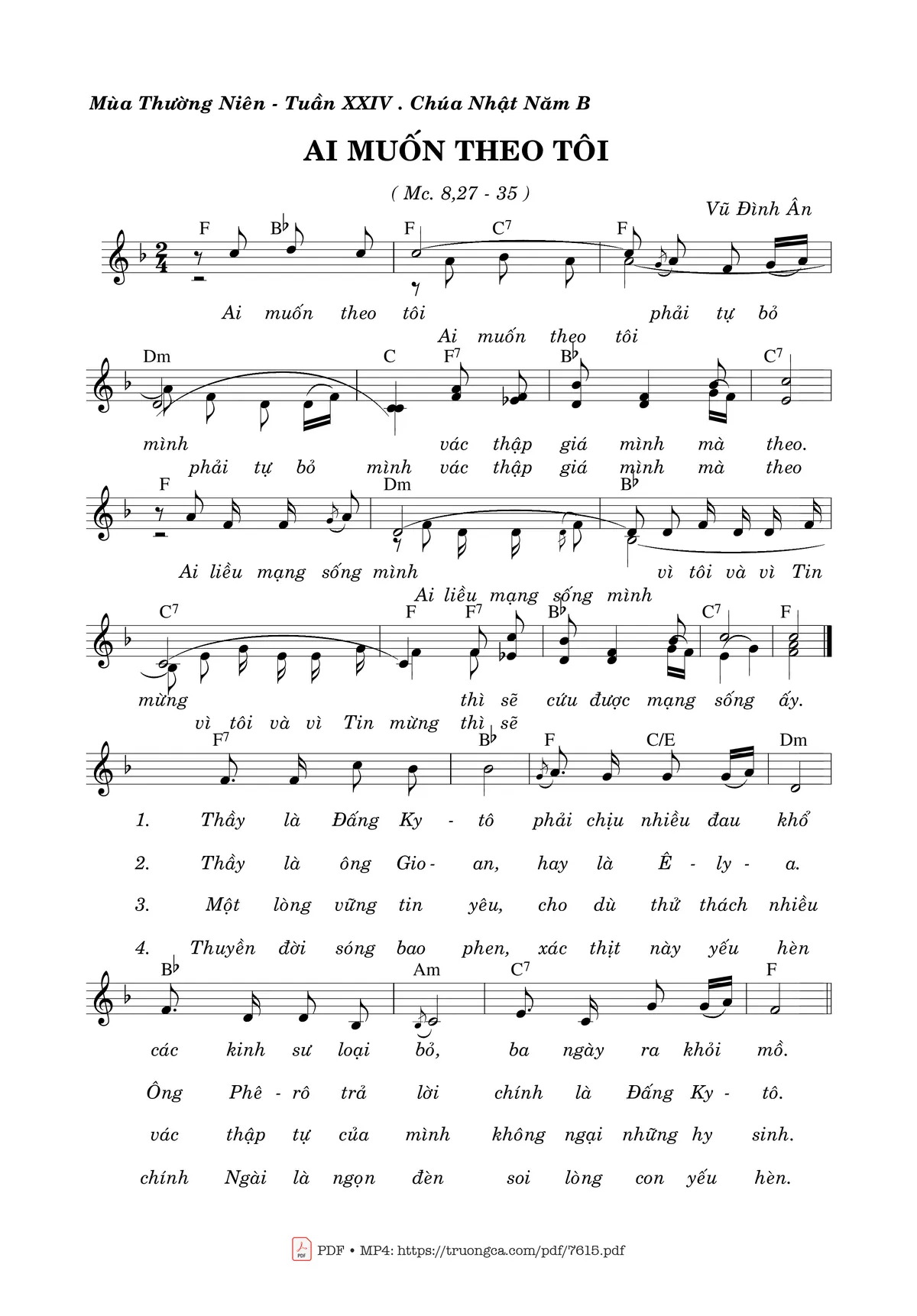 ĐK. Ai muốn theo tôi phải tự bỏ mình vác thập giá mình mà theo. Ai liều mạng sống mình vì Tin Mừng thì sẽ cứu được mạng sống ấy.