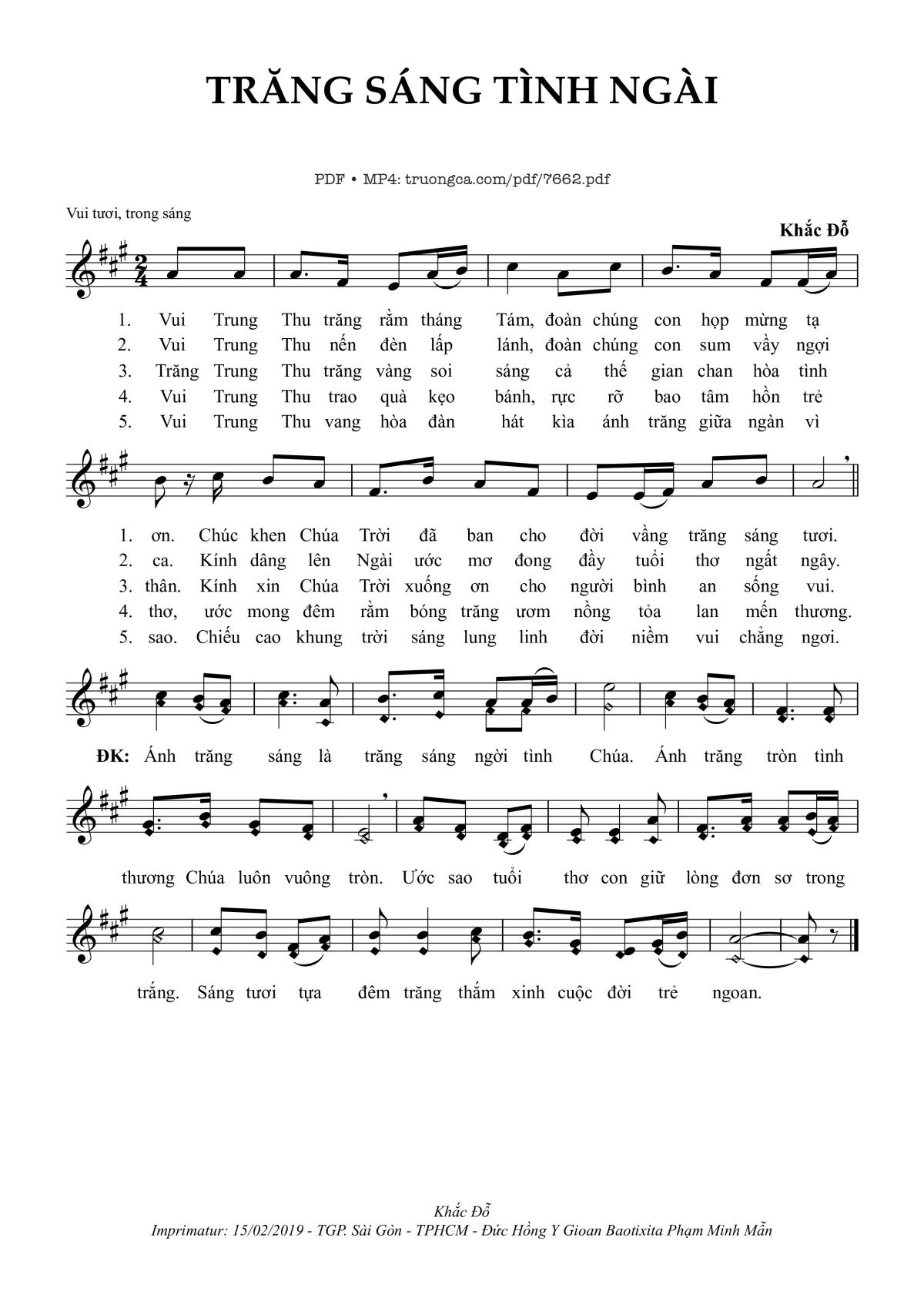 ĐK: Ánh trăng sáng là trăng sáng ngời tình Chúa. Ánh trăng tròn tình thương Chúa luôn vuông tròn. Ước sao tuổi thơ con giữ lòng đơn sơ trong trắng. Sáng tươi tựa đêm trăng thắm xinh cuộc đời trẻ ngoan.