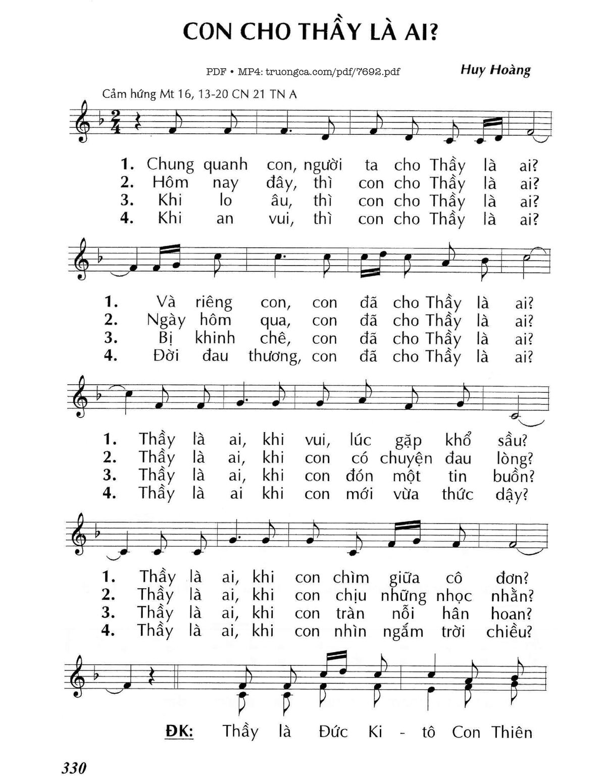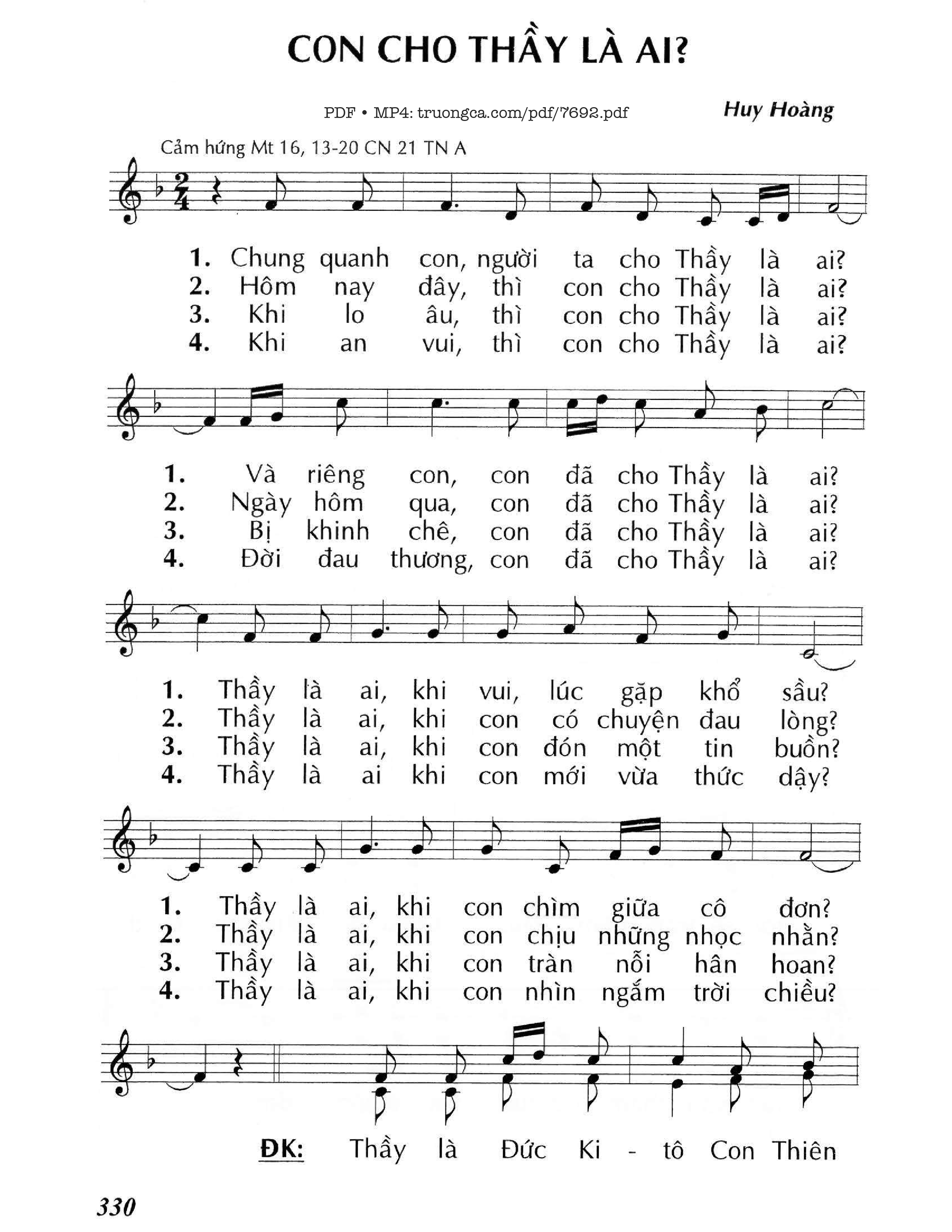 1) Chung quanh con, người ta cho Thầy là ai? Và riêng con, con đã cho Thầy là ai? Thầy là ai, khi vui, lúc gặp khổ sầu? Thầy là ai, khi con chìm giữa cô đơn?