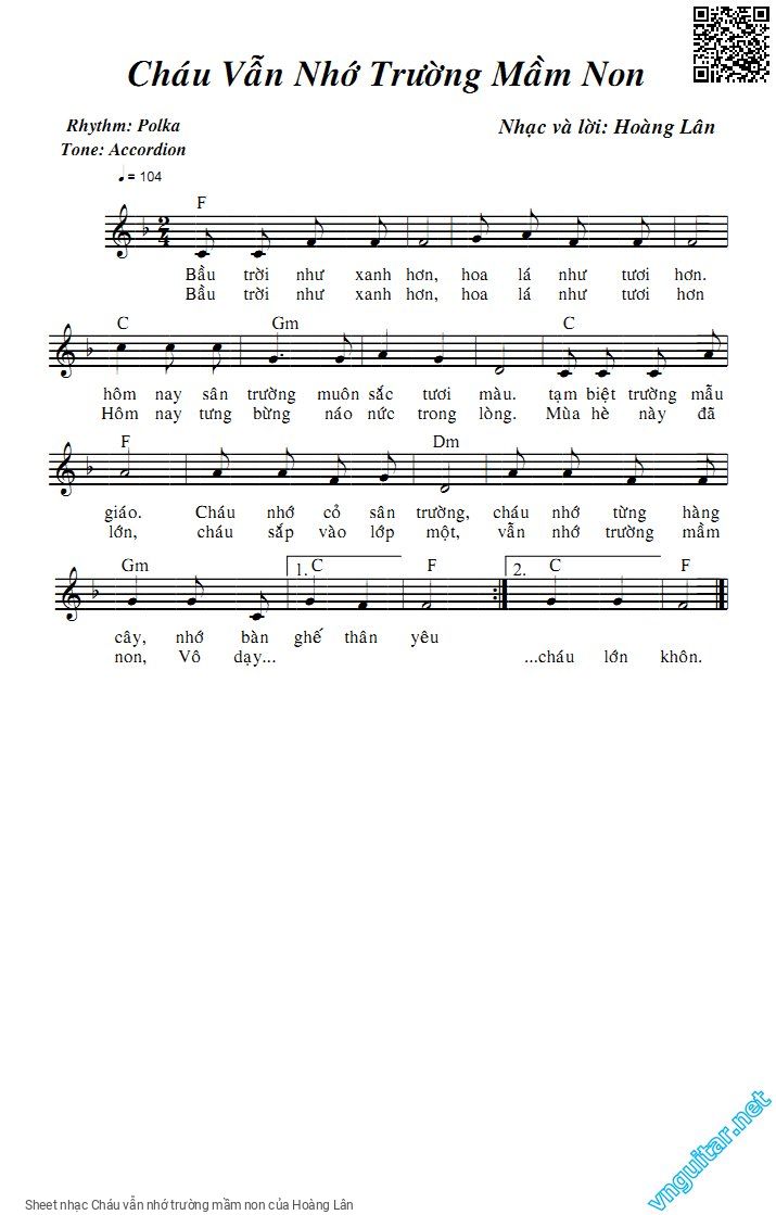 Transposition is the process of moving a song's melody and chords up or down in pitch by a constant interval. The direction of the transposition tool is indicated by a plus (+) sign for up and a minus (-) sign for down. Hover mouse over chords signs to see the chords chart of Cháu vẫn nhớ trường mầm non song.