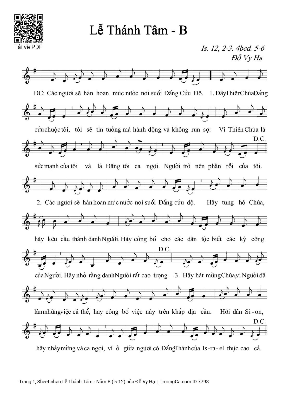 1. Đây Thiên Chúa, Đấng Cứu Chuộc tôi, tôi sẽ tin tưởng mà hành động và không run sợ: vì Thiên Chúa là sức mạnh của tôi và là Đấng tôi ca ngợi, Người trở nên phần rỗi của tôi.2. Các ngươi sẽ hân hoan múc nước nơi suối Đấng Cứu Độ. Hãy tung hô Chúa, hãy kêu cầu thánh danh Người. Hãy công bố cho các dân tộc biết các kỳ công của Người. Hãy nhớ rằng danh Người rất cao trọng.