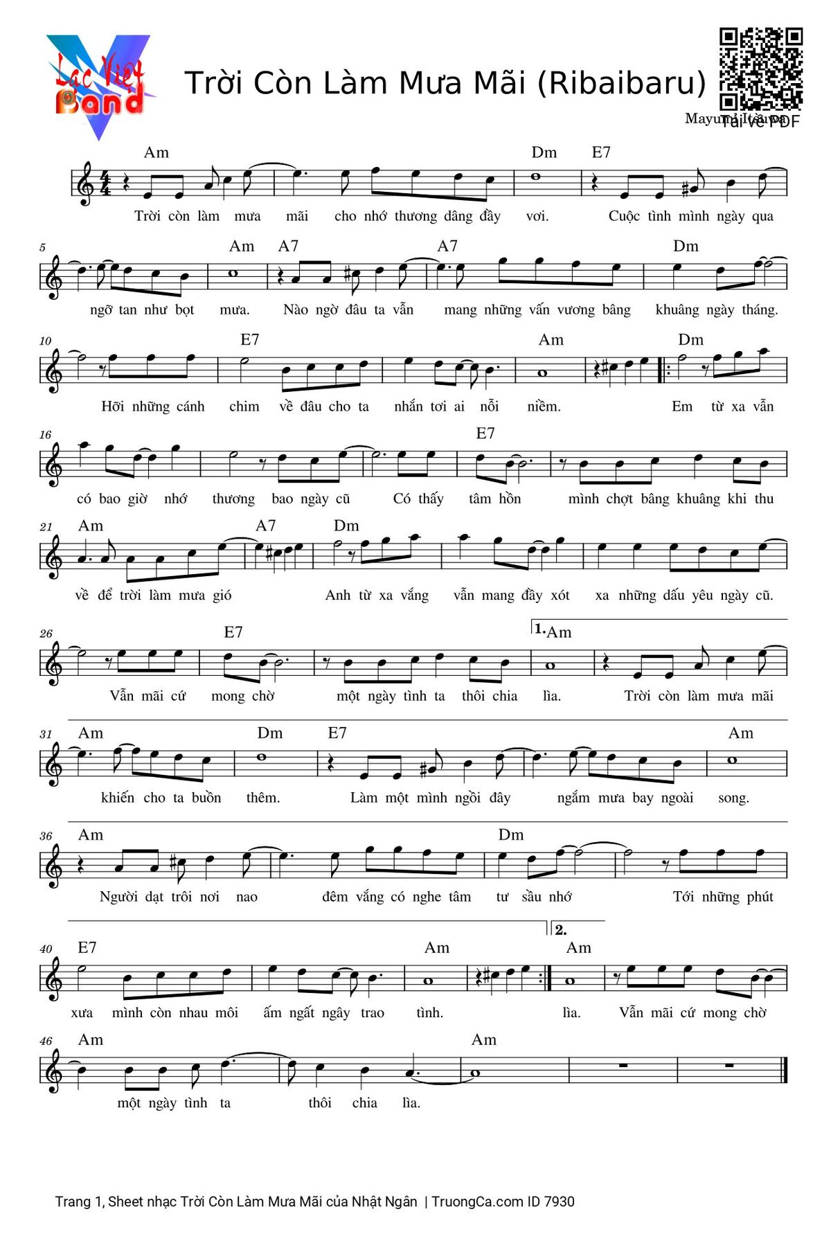 The Videos/audios Trời Còn Làm Mưa Mãi by Nhật Ngân were embed from Youtube, Musescore or the other 3rd links. Videos are subject to 3rd's copyright control and may be removed by YouTube's copyright rules and 3rd's policies or maybe included advertisements. If you cannot access to these songs, this mean that have been removed.