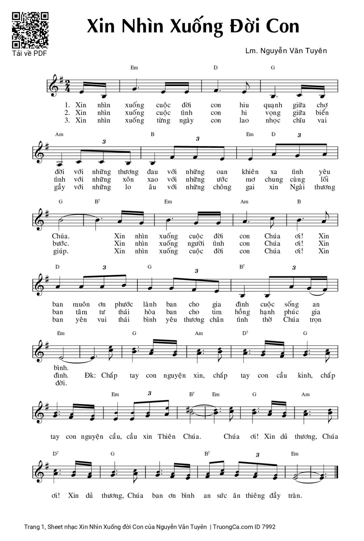 3. Xin nhìn xuống từng ngày con lao nhọc. Trĩu vai gầy với những lo âu, với những chông gai xin Ngài thương giúp. Xin nhìn xuống cuộc đời con, Chúa ơi. Xin ban yên vui thái bình, yêu thương chân tình, thờ Chúa trọn đời.