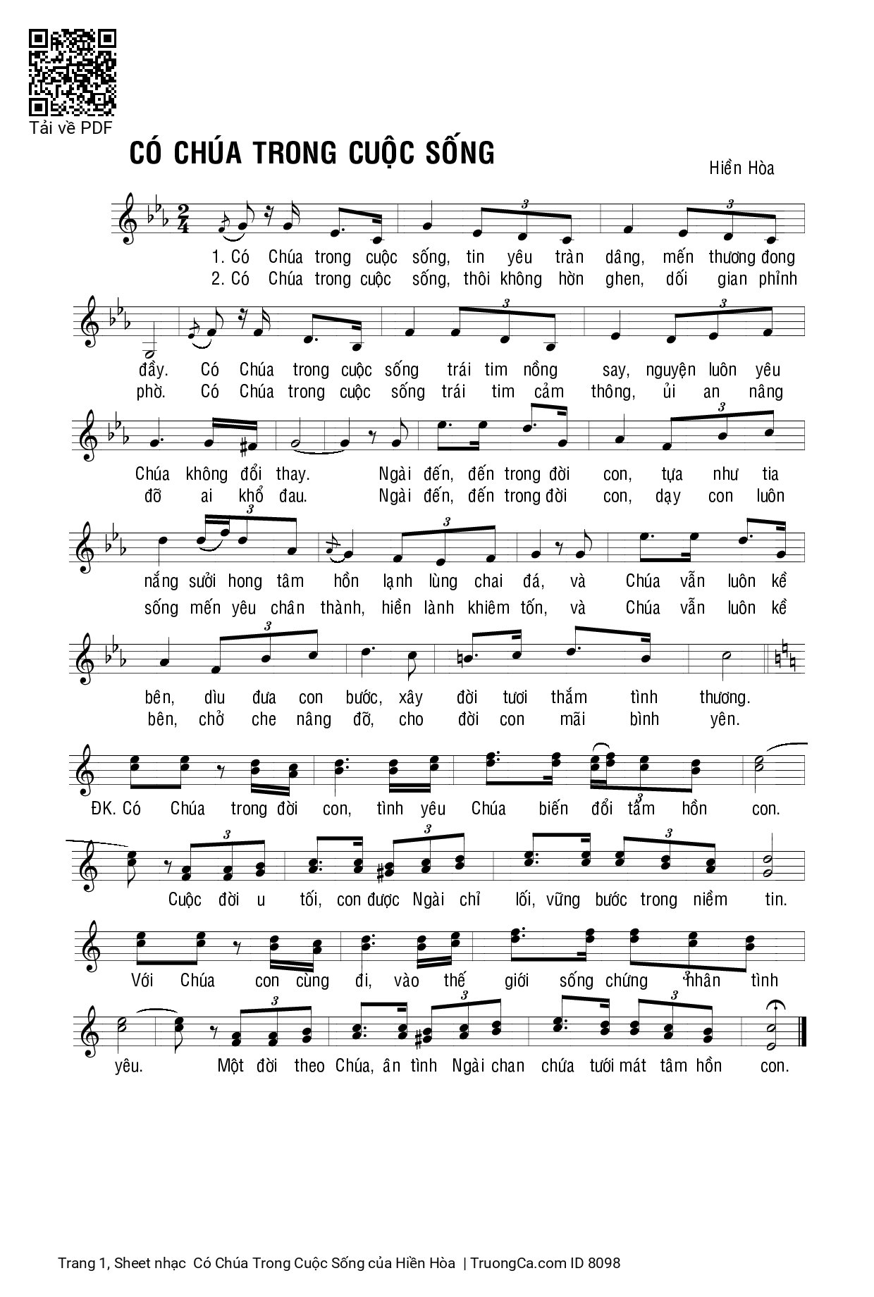 1. Có Chúa trong cuộc sống, tin yêu tràn dâng, mến thương đong đầy. Có Chúa trong cuộc sống trái tim nồng say, nguyện luôn yêu Chúa không đổi thay. Ngài đến, đến trong đời con, tựa như tia nắng sưởi hong tâm hồn lạnh lùng chai đá, và Chúa vẫn luôn kề bên, dìu đưa con bước, xây đời tươi thắm tình thương.