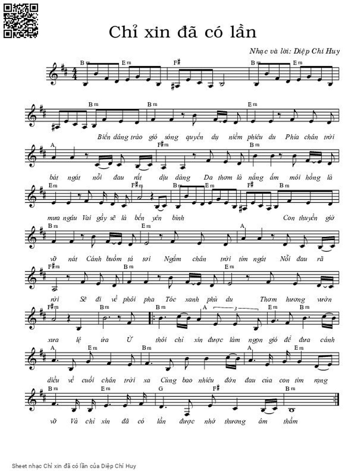 The Videos/audios Chỉ xin đã có lần by Diệp Chí Huy were embed from Youtube, Musescore or the other 3rd links. Videos are subject to 3rd's copyright control and may be removed by YouTube's copyright rules and 3rd's policies or maybe included advertisements. If you cannot access to these songs, this mean that have been removed.