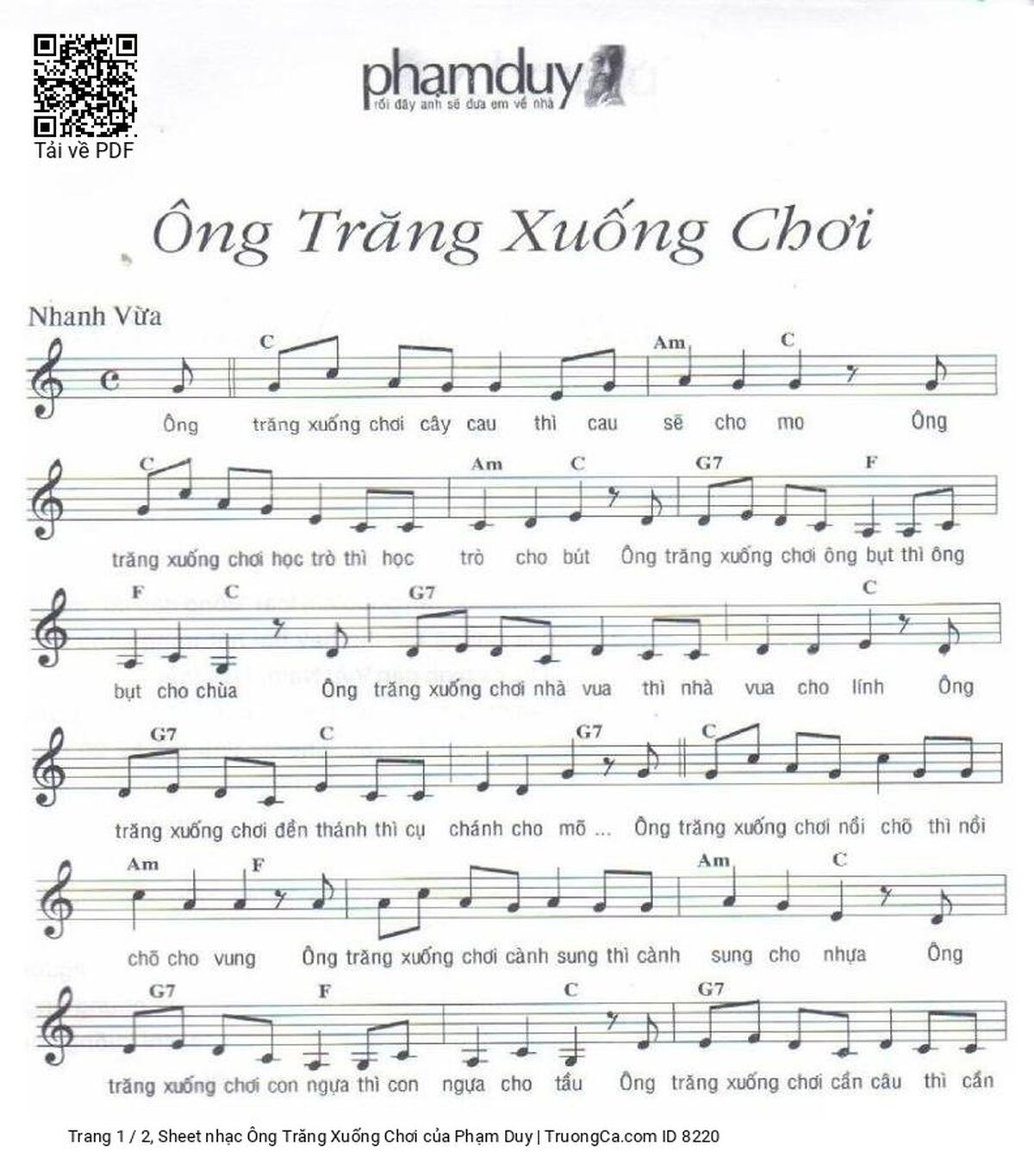 Sheet music Ông Trăng Xuống Chơi by Phạm Duy and PDF file was posted here to support you to practice singing perfectly. Sheets with notes and chords are for reference only, for non-commercial purposes only, not involved with earning money by buying and selling. Copyright is belong to song writer/author and copyright owner. Truongca.com do not own any copyrighted content. You can download the high-quality PDF files which contain staffs by PDF link above.