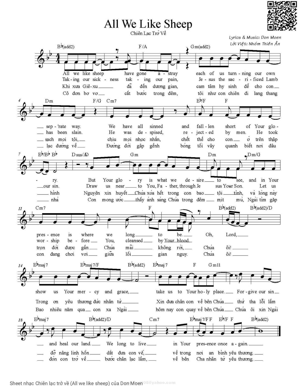 The Videos/audios Chiên lạc trở về (All we like sheep) by Don Moen were embed from Youtube, Musescore or the other 3rd links. Videos are subject to 3rd's copyright control and may be removed by YouTube's copyright rules and 3rd's policies or maybe included advertisements. If you cannot access to these songs, this mean that have been removed.