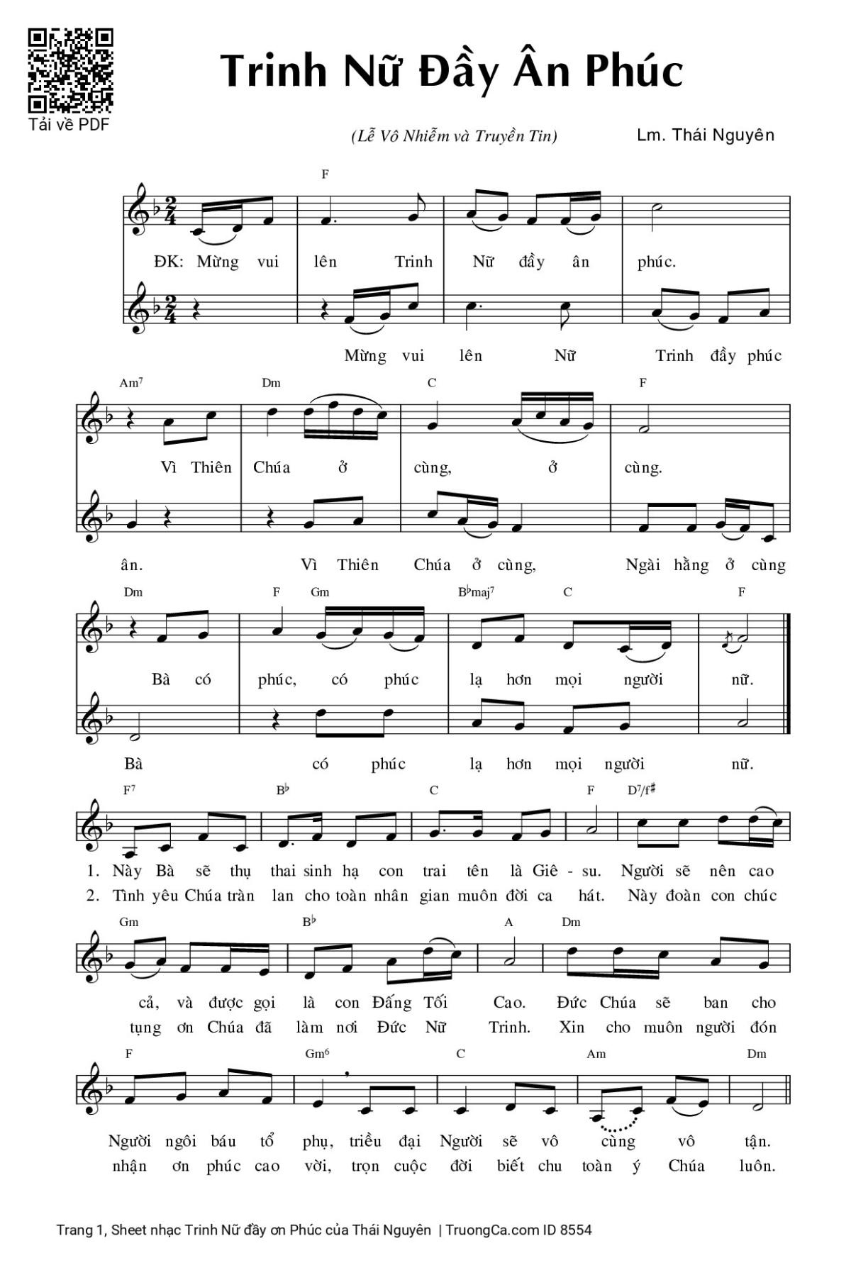 Thái Nguyên Mừng vui lên Trinh Nữ đầy ân phúc Vì Thiên Chúa ở cùng [PDF] [Sheet] [Lyrics] [Mp4/Midi]