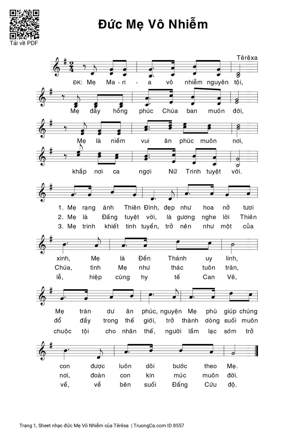 Têrêsa Mẹ Maria vô nhiễm nguyên tội Mẹ đầy hồng phúc Chúa ban muôn đời [PDF] [Sheet] [Lyrics] [Mp4/Midi]