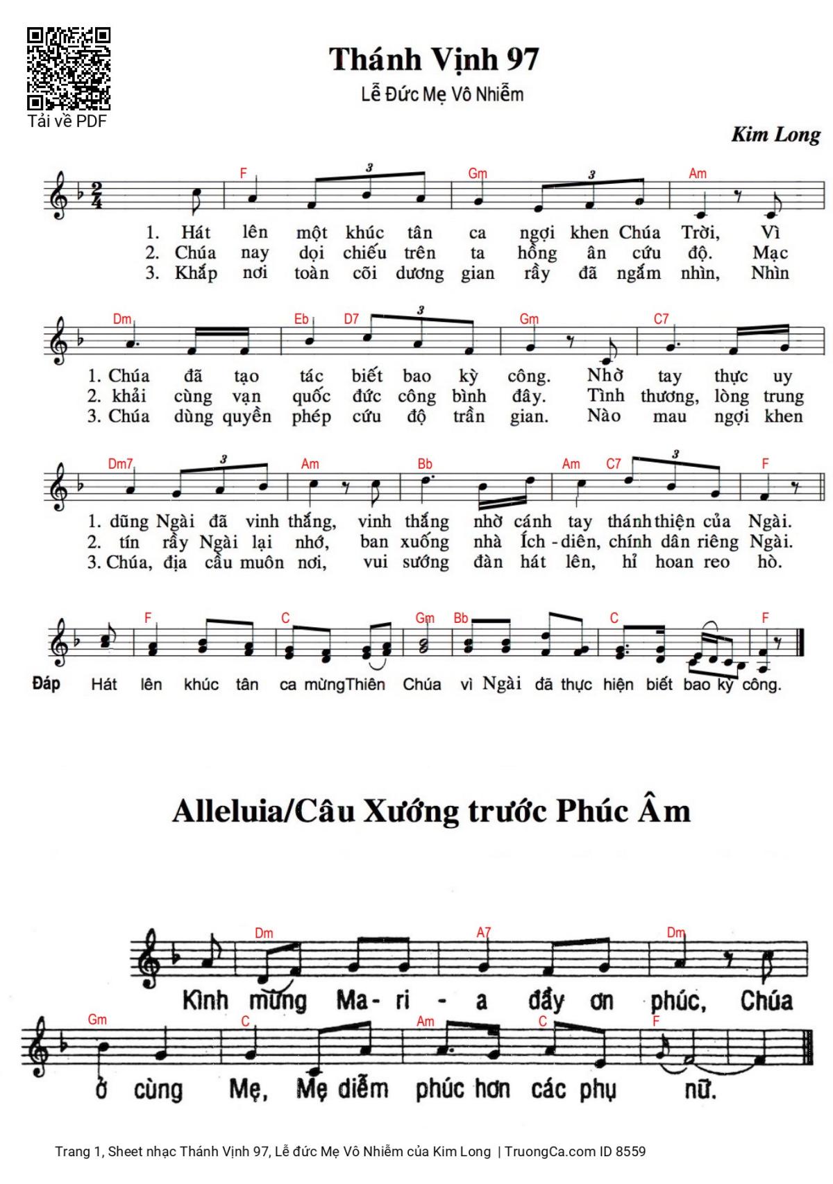 The Videos/audios Thánh Vịnh 97, Lễ đức Mẹ Vô Nhiễm by Kim Long were embed from Youtube, Musescore or the other 3rd links. Videos are subject to 3rd's copyright control and may be removed by YouTube's copyright rules and 3rd's policies or maybe included advertisements. If you cannot access to these songs, this mean that have been removed.