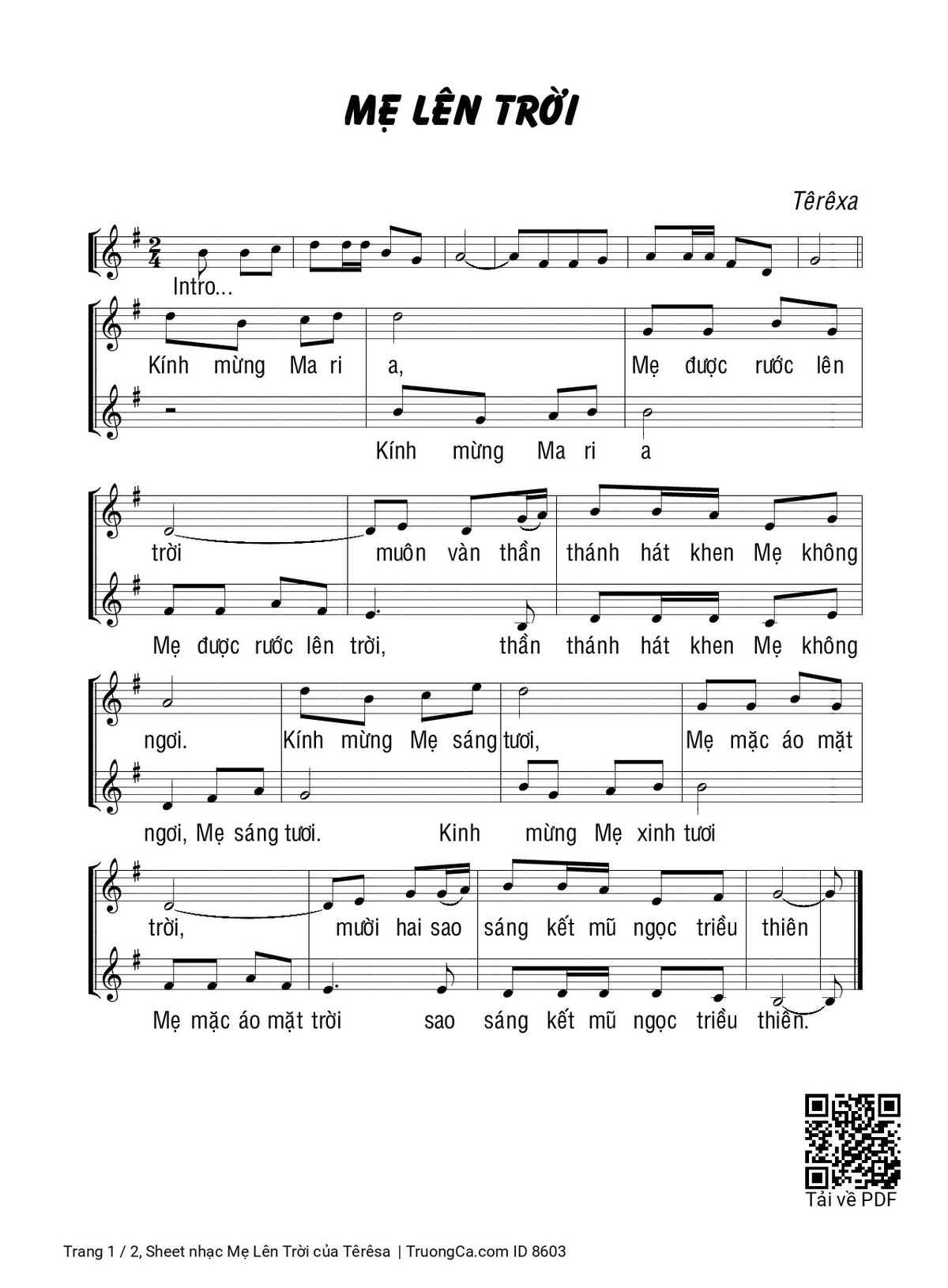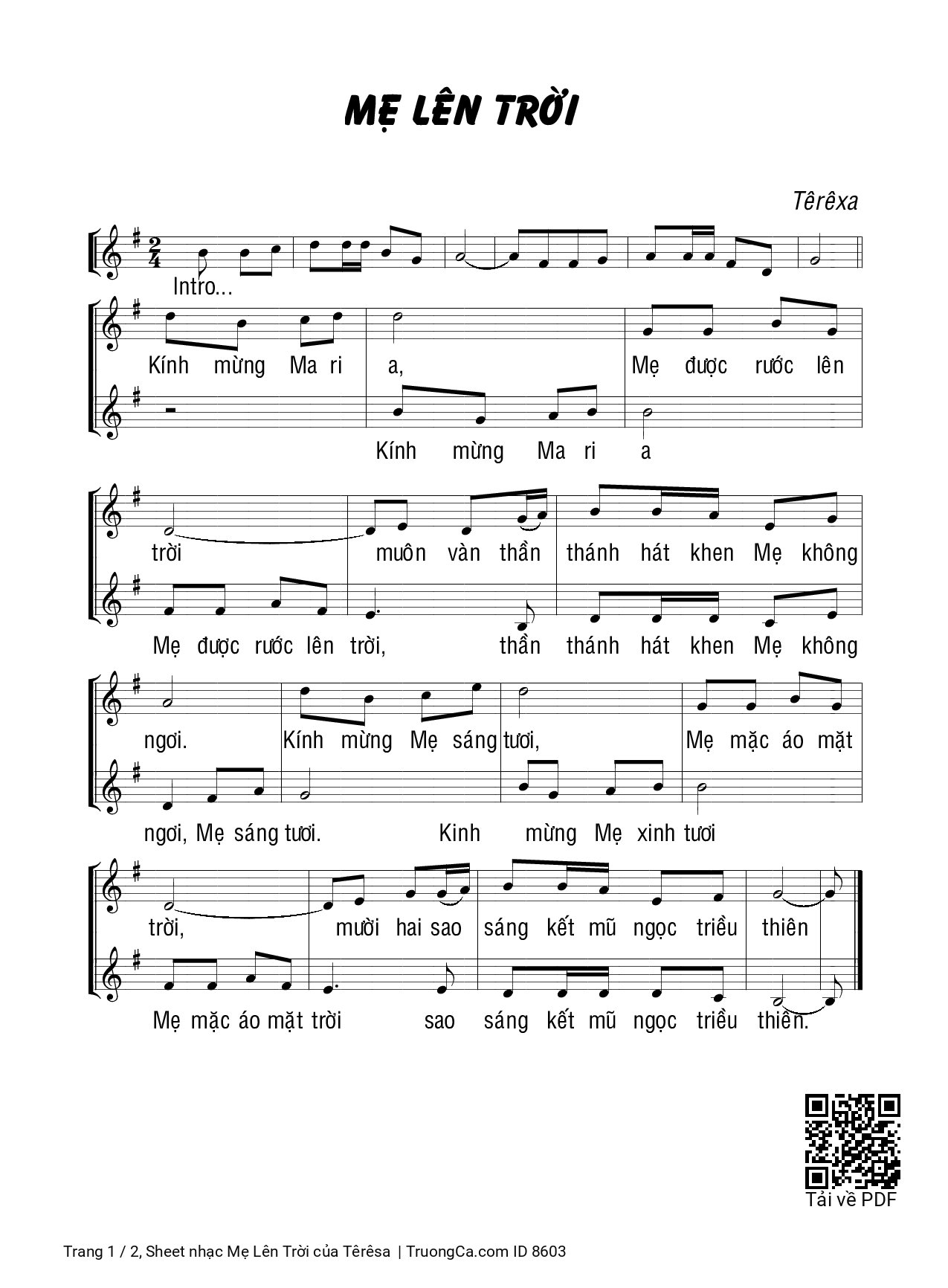 Têrêsa Kính mừng Maria Mẹ được rước lên trời [PDF] [Sheet] [Lyrics] [Mp4/Midi]