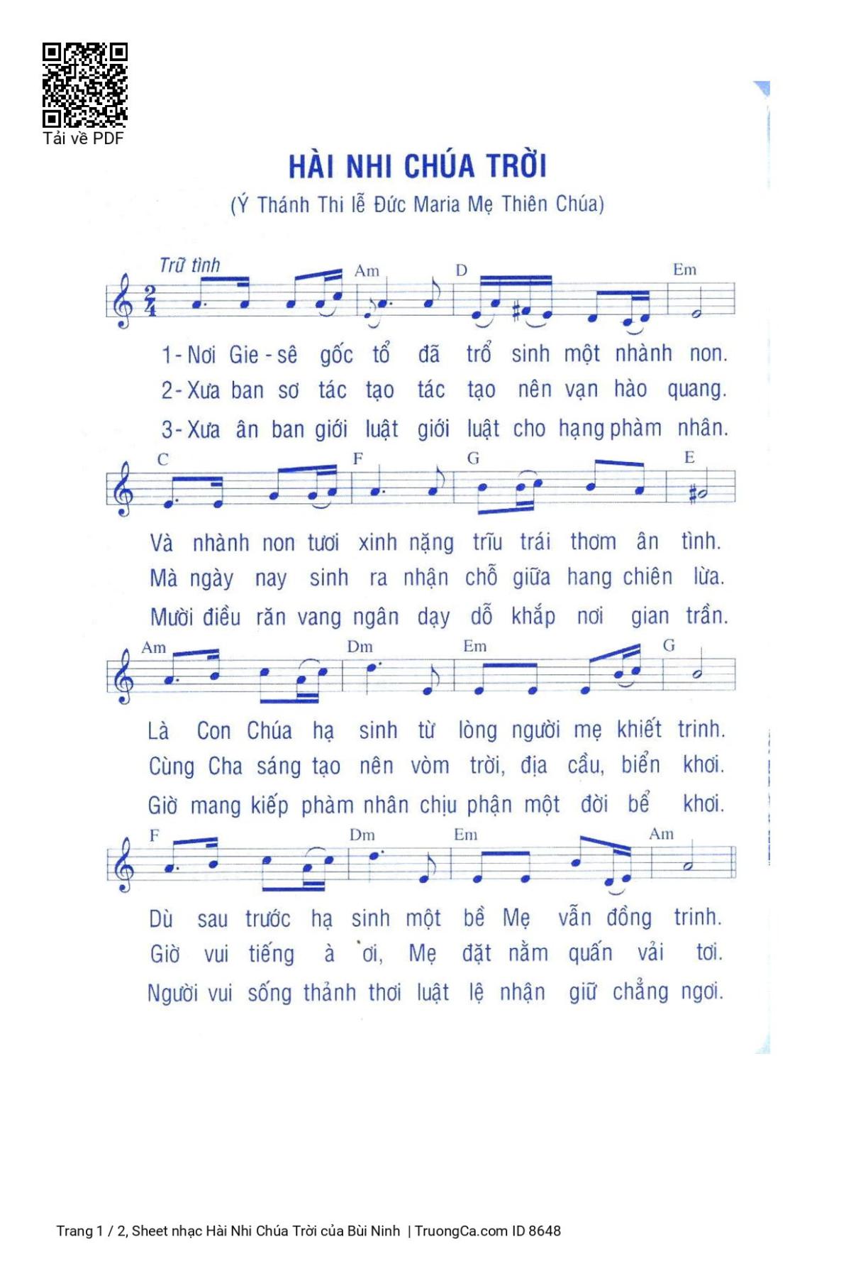 The Videos/audios Hài Nhi Chúa Trời by Bùi Ninh were embed from Youtube, Musescore or the other 3rd links. Videos are subject to 3rd's copyright control and may be removed by YouTube's copyright rules and 3rd's policies or maybe included advertisements. If you cannot access to these songs, this mean that have been removed.
