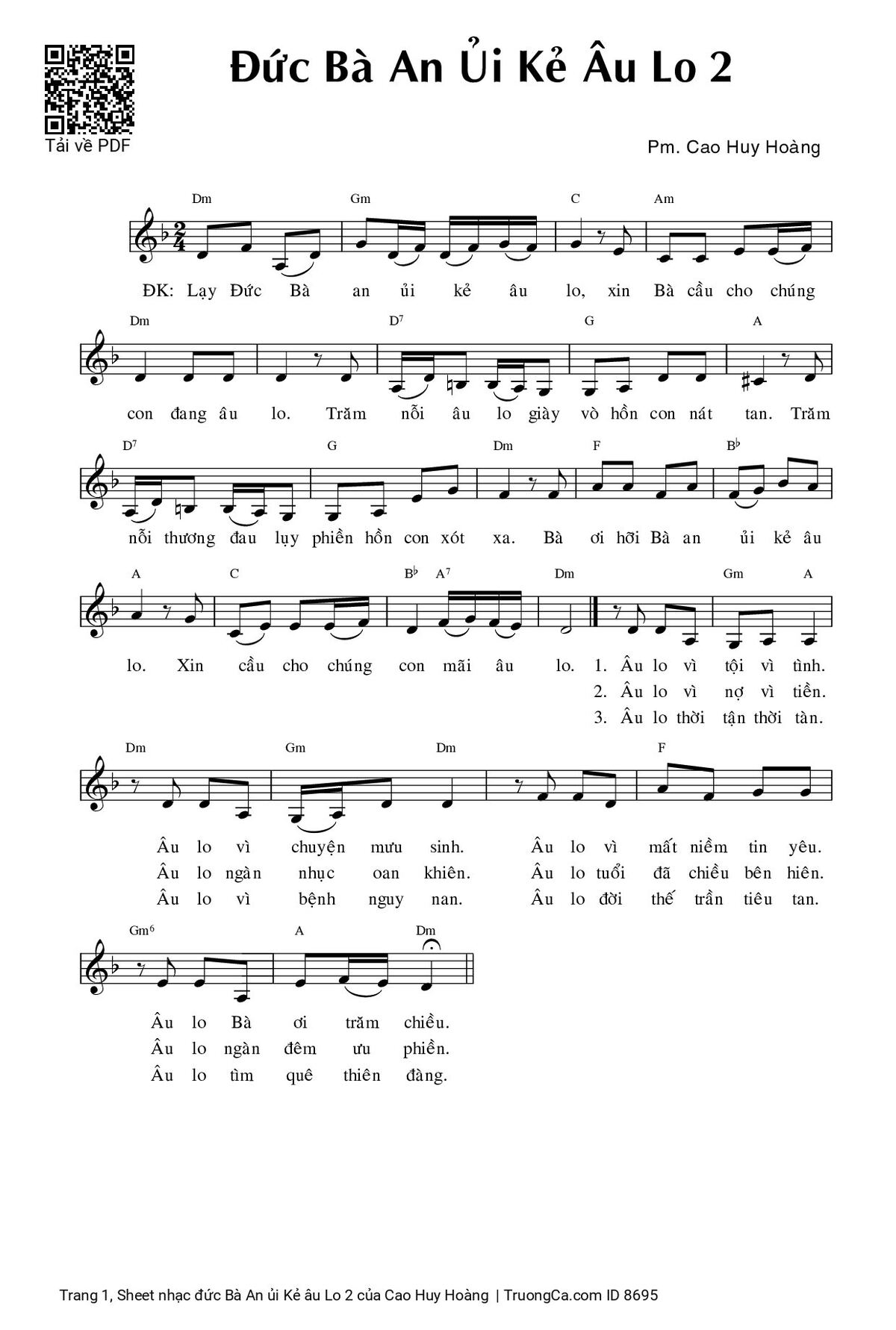 ĐK. Lạy Đức Bà an ủi kẻ âu lo, xin Bà cầu cho chúng con đang âu lo. Trăm nỗi âu lo giày vò hồn con nát tan. Trăm nỗi thương đau lụy phiền hồn con xót xa. Bà ơi hỡi Bà an ủi kẻ âu lo. Xin cầu cho chúng con mãi âu lo.