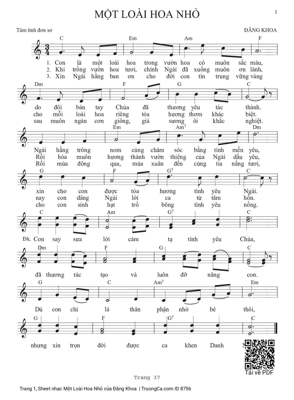 1. Con là một loài hoa trong vườn hoa có muôn sắc mầu, do đôi bàn tay Chúa đã thương yêu tác thành. Ngài hằng trông nom cùng chăm sóc bằng tình mến yêu, xin cho con được toả hương tình yêu Ngài.