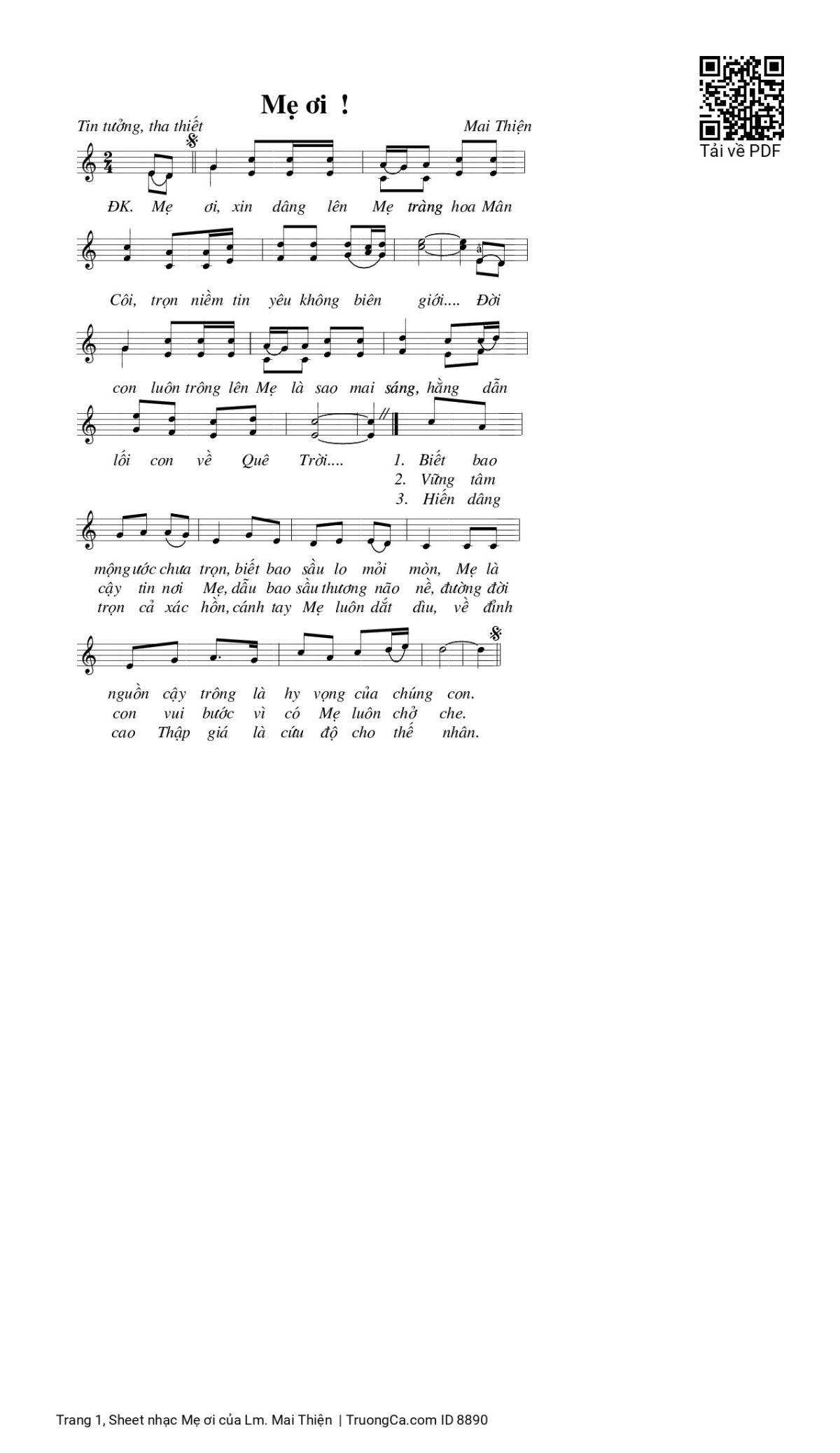 Điệp khúc. Mẹ ơi, xin dâng lên Mẹ tràng hoa Mân Côi trọn niềm tin yêu không biên giới. Đời con luôn trông lên Mẹ là sao mai sáng, hằng dẫn lối con về Quê Trời.
