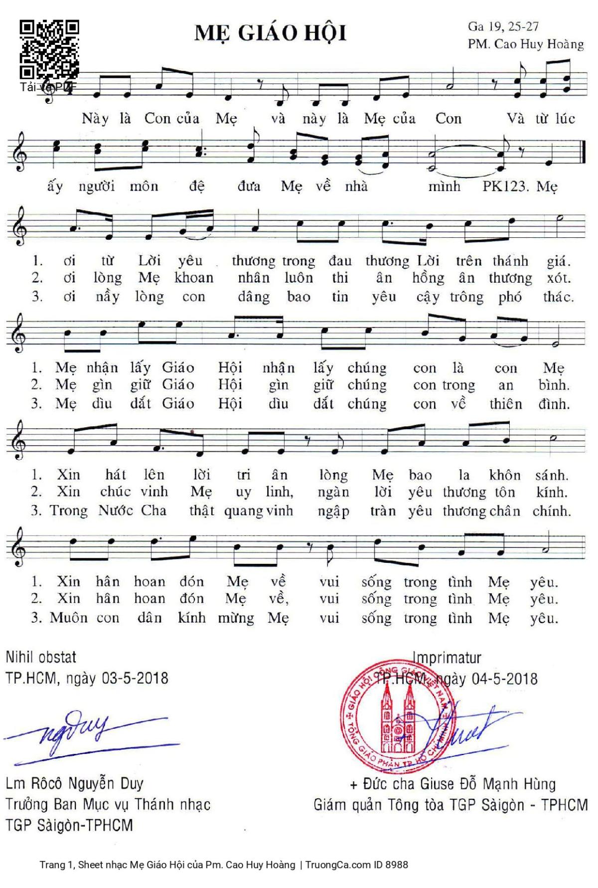 1. Mẹ ơi! Từ Lời yêu thương trong đau thương Lời trên thánh giá. Mẹ nhận lấy Giáo Hội, nhận lấy chúng con là con Mẹ. Xin hát lên lời tri ân lòng Mẹ bao la khôn sánh. Xin hân hoan đón Mẹ về vui sống trong tình Mẹ yêu.