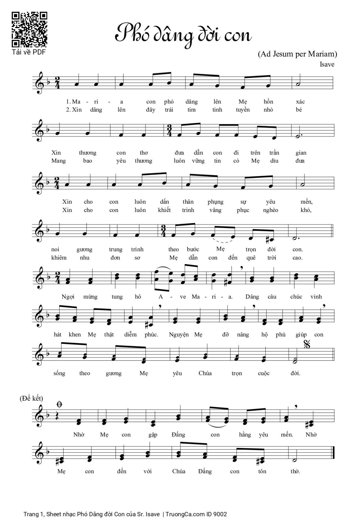1. Ma-ri-a con phó dâng lên Mẹ hồn xác. Xin thương con thơ đưa dẫn con đi trên trần gian. Xin cho con luôn dấn thân phụng sự yêu mến. Noi gương trung trinh theo bước Mẹ trọn đời con.